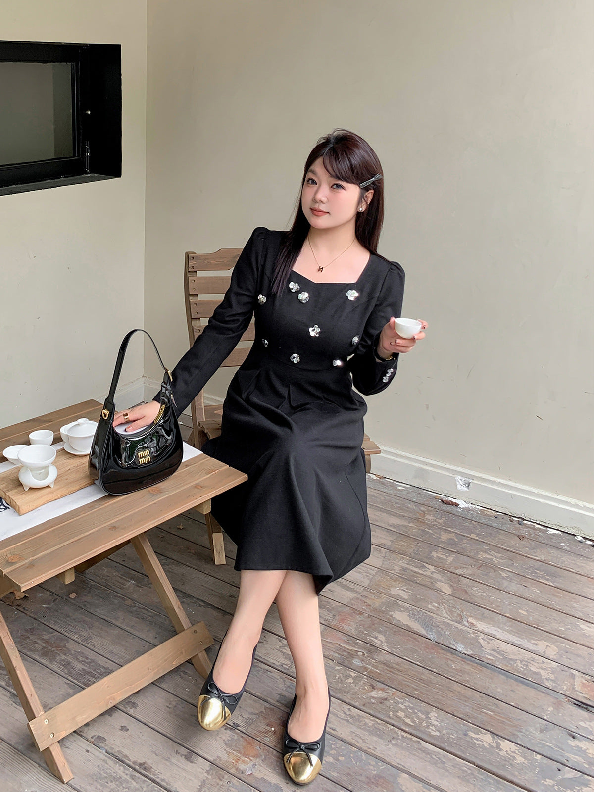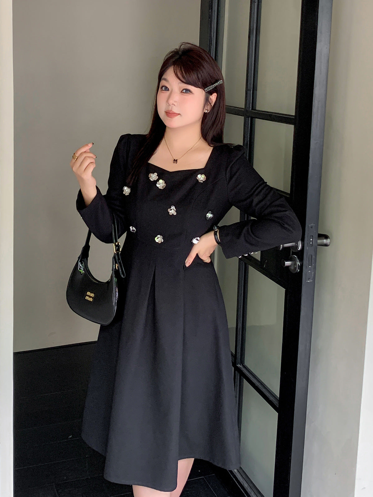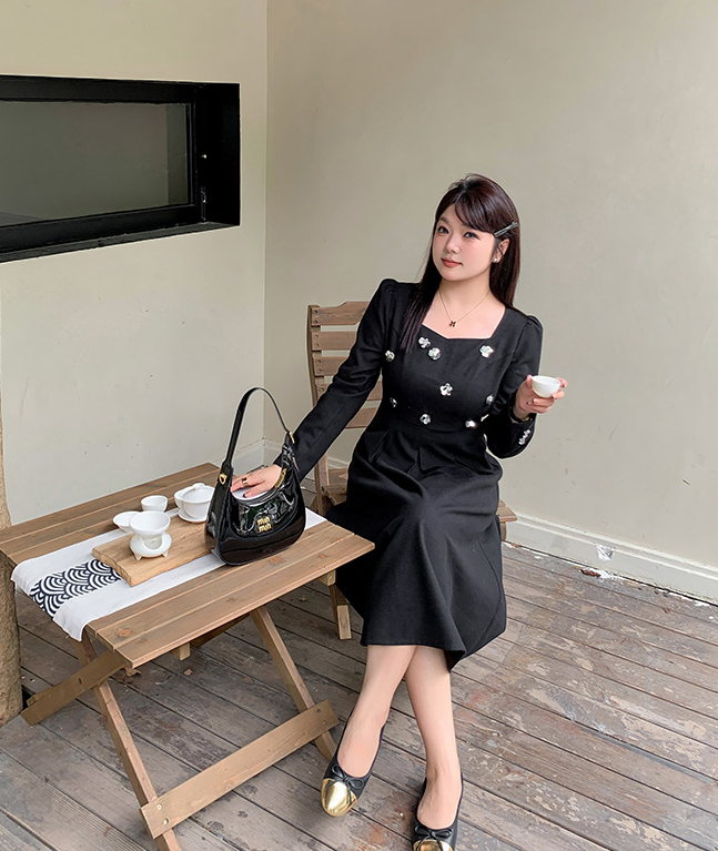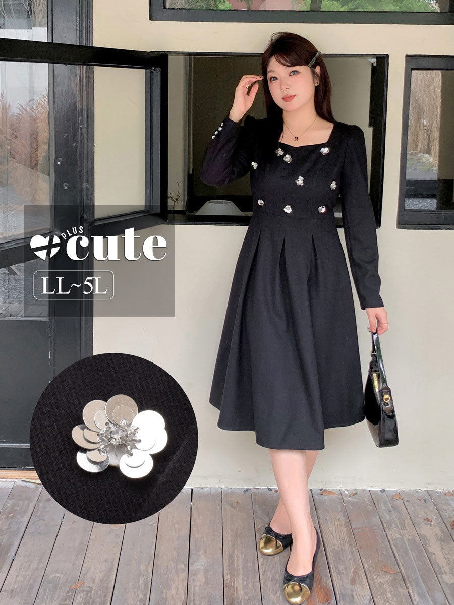 大きいサイズ レディース スパンコールスクエアネックブラックワンピース LL 3L 4L 5L