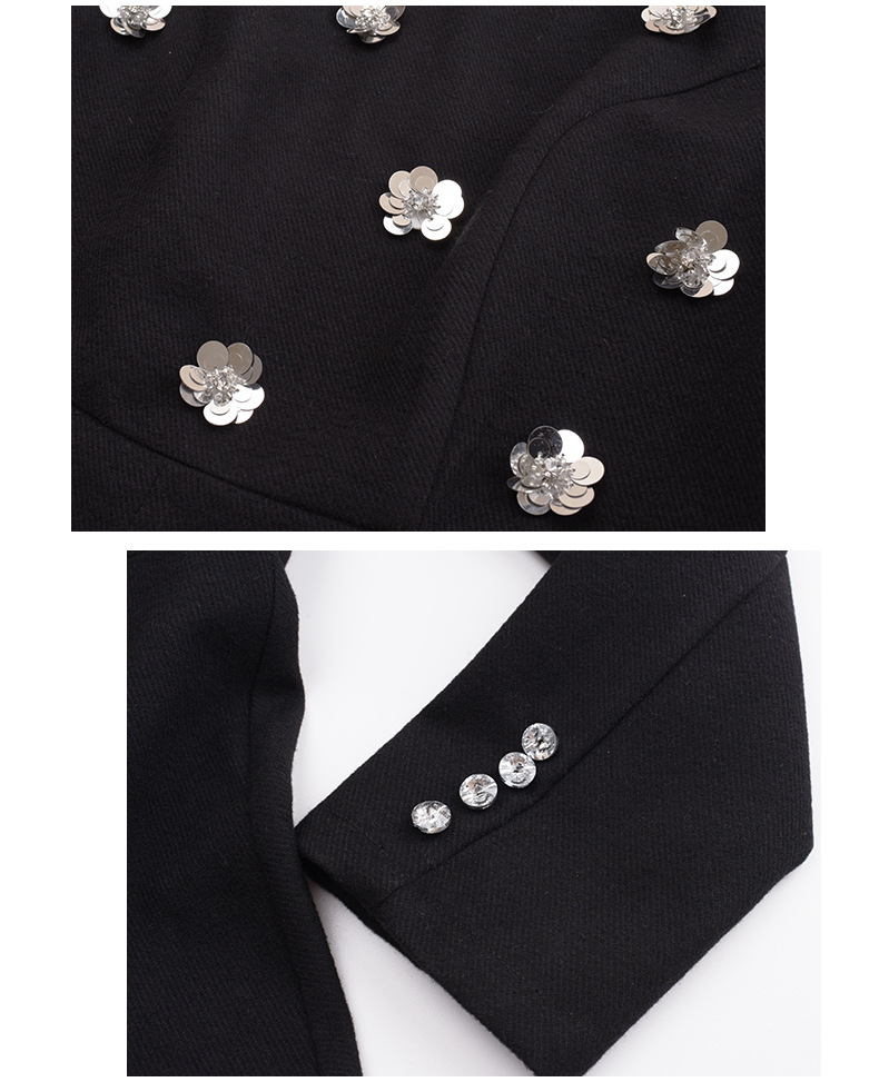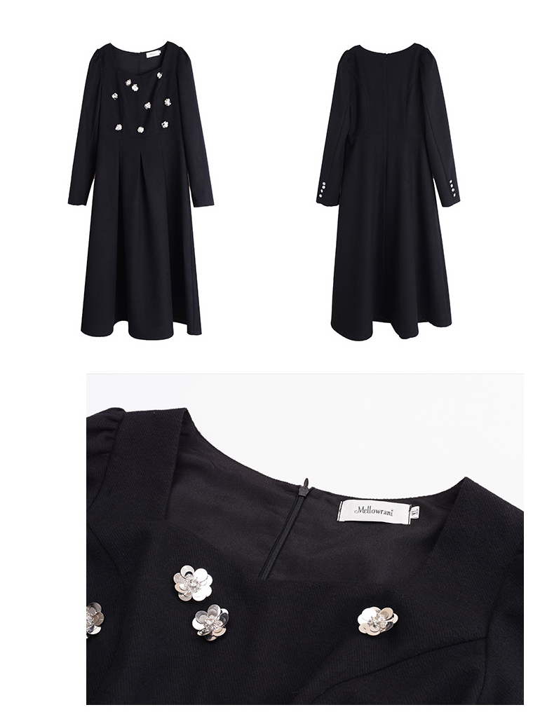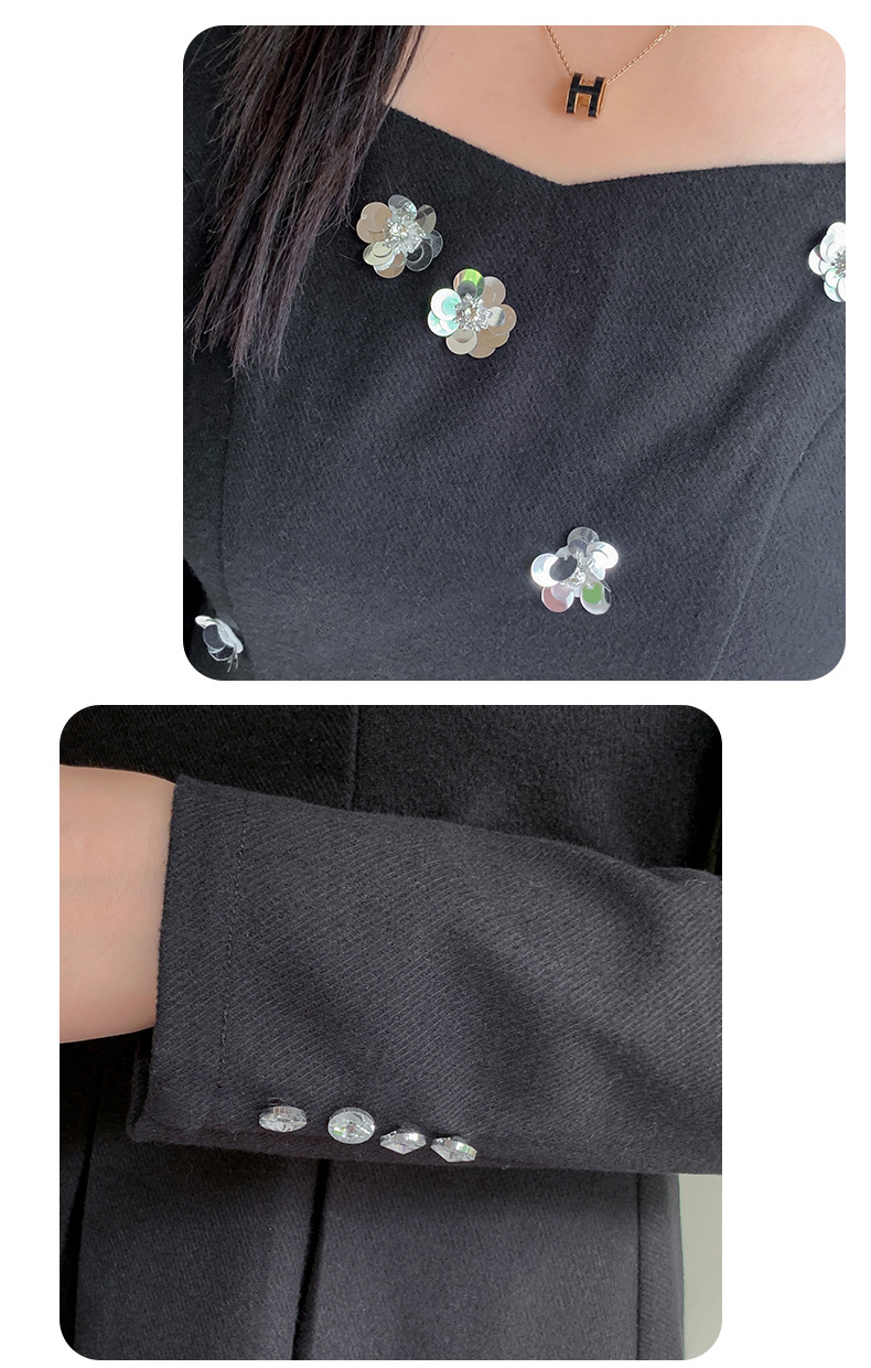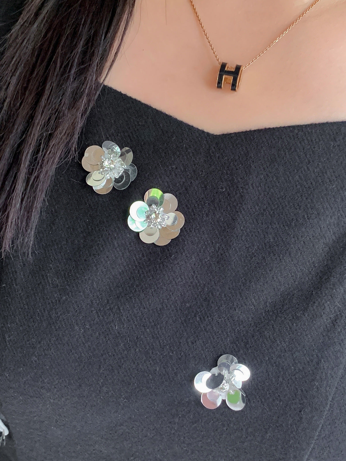 シルバーの花をあしらったリトルブラックドレスが登場。ツイル生地で作られており、柔らかな質感をお楽しみいただけます。フロントと肩の袖には小さなスパンコールが散りばめられています。ウエストを絞っているので、美しいシルエットでご着用いただけます。