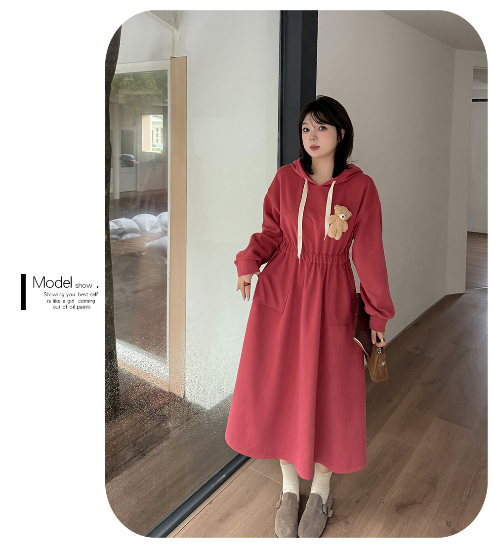 暖かくて厚みがあり、着心地の良いスウェットワンピース。ニット素材の合成コットン生地を使用し、密度が高く柔らかく、手に持つと重厚感があります。やや伸縮性のあるフードと、ネックラインに幅広のドローストリングが付いています。胸元には可愛いクマのマスコットが付いています。ゆったりとしたドロップショルダーです。ウエストはゴム仕様、フロントには大きなポケットが2つ付いています。大きなアンブレラ型の裾が可愛らしく、体型を補正し着痩せ効果も期待できます。カジュアルで年齢を感じさせないスタイルです。