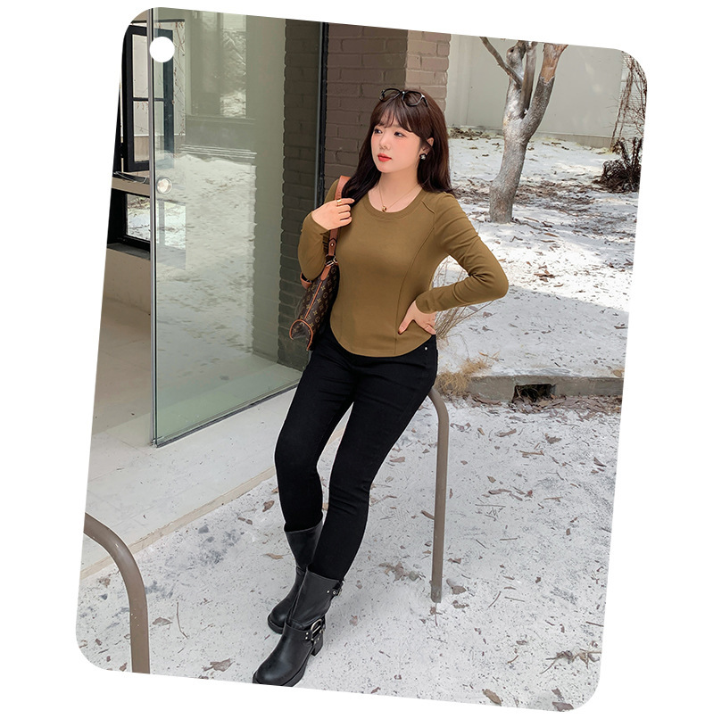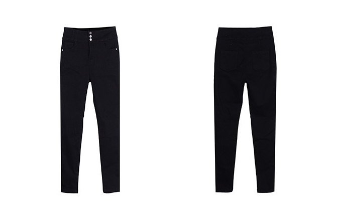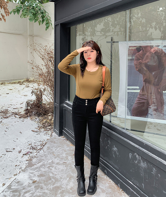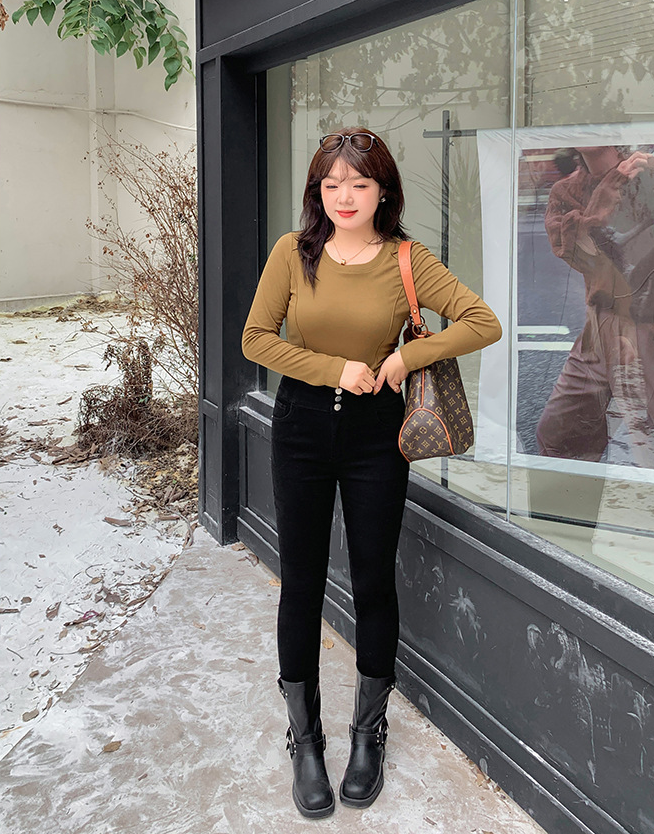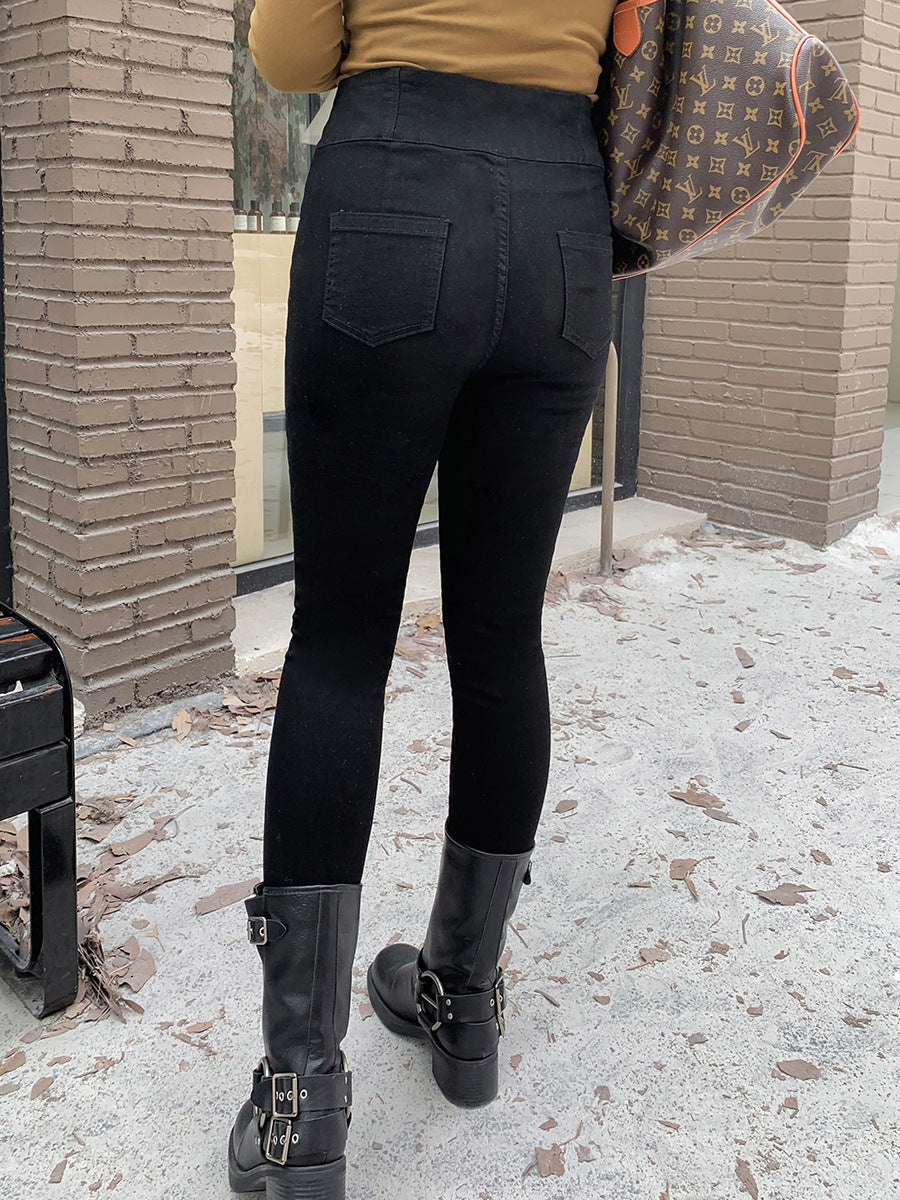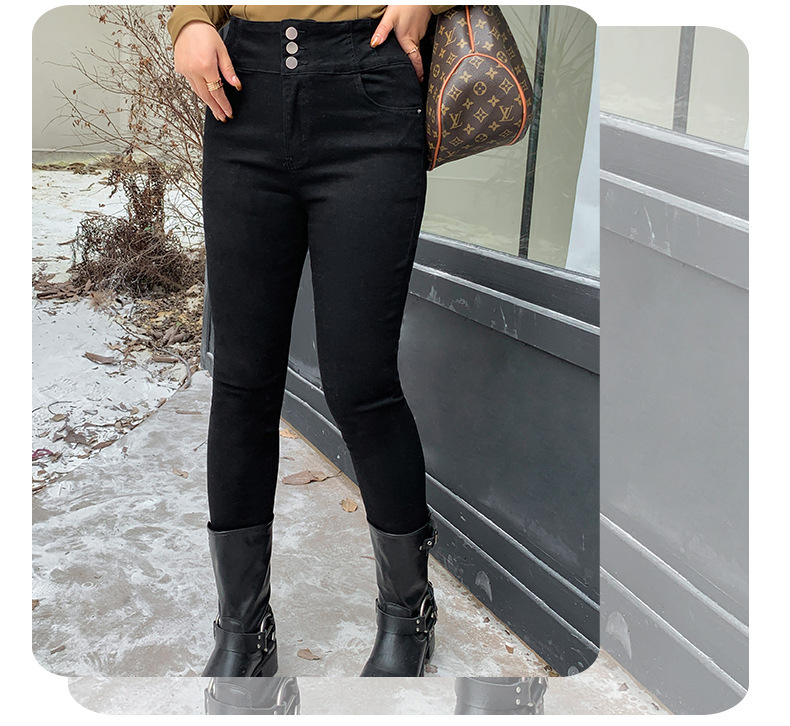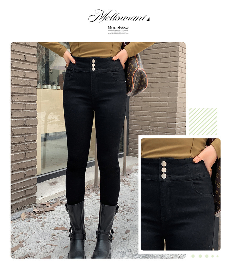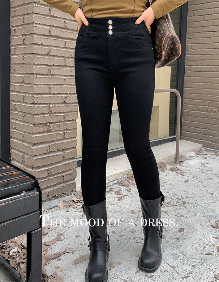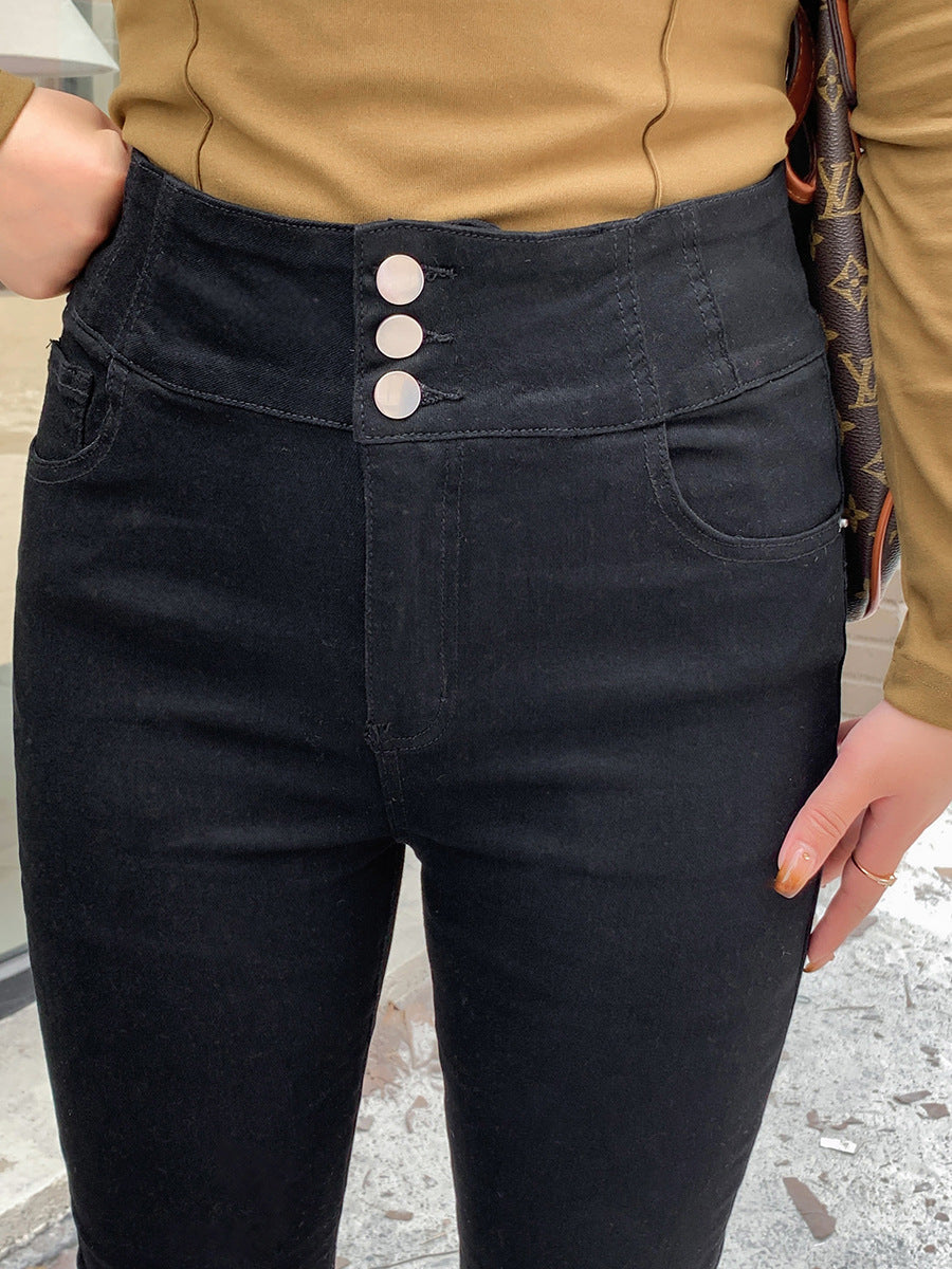 ハイウエストのタイトな黒のデニムパンツは、ストレッチ性の高いデニム生地を使用し、厚手でタイトな着心地を実現。ハイウエストとワイドウエストのデザイン、おしゃれな3列ボタンで、フロントはジッパー付きです。ウエストは程よい高さで腰をしっかりガードし、暖かく快適です。スリムフィットで合わせやすく、デイリーに履きやすいデザインです。