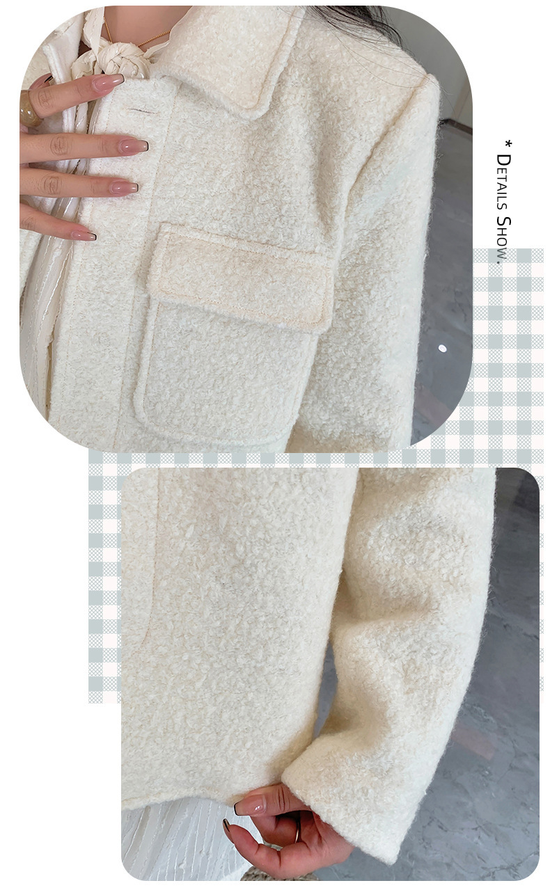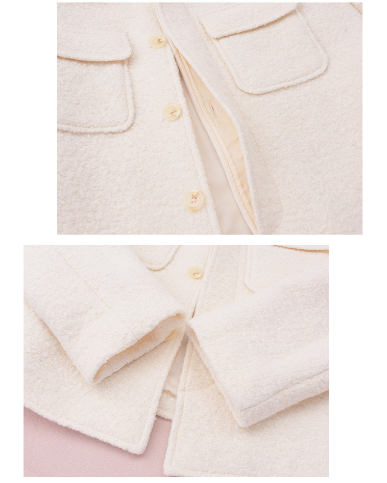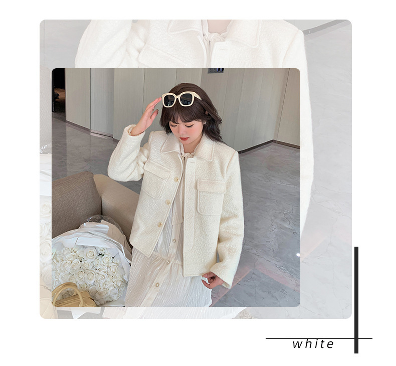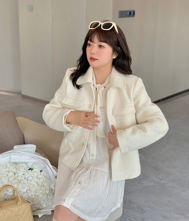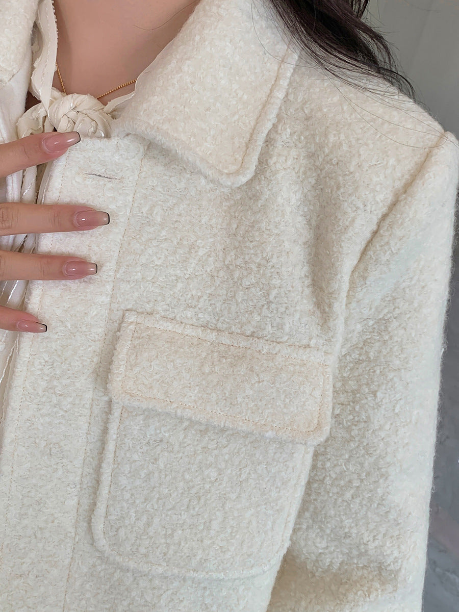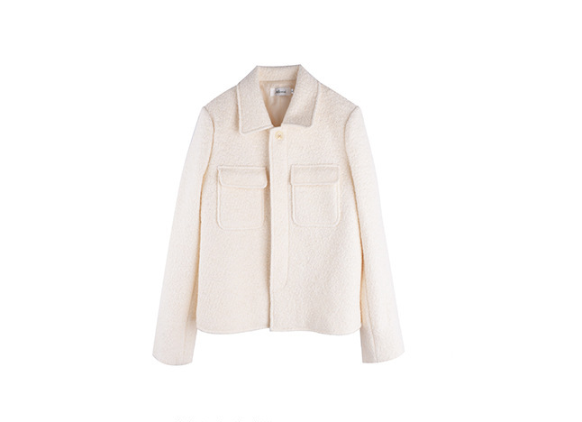 実用性も高く、しっかりとした作りで暖かいショートジャケットです。ブークレ生地が可愛らしく、着心地も抜群です。柔らかく、厚みがあり、暖かさも抜群です。ブークレ感のある特殊な生地を使用しています。すっきりとした小ぶりのラペルと胸元にはポケット付き。ウエストを細く、脚を長く見せるシルエットで、柔らかく羊のような可愛らしい雰囲気を醸し出します。いろいろな場面で合わせやすいアイテムです!