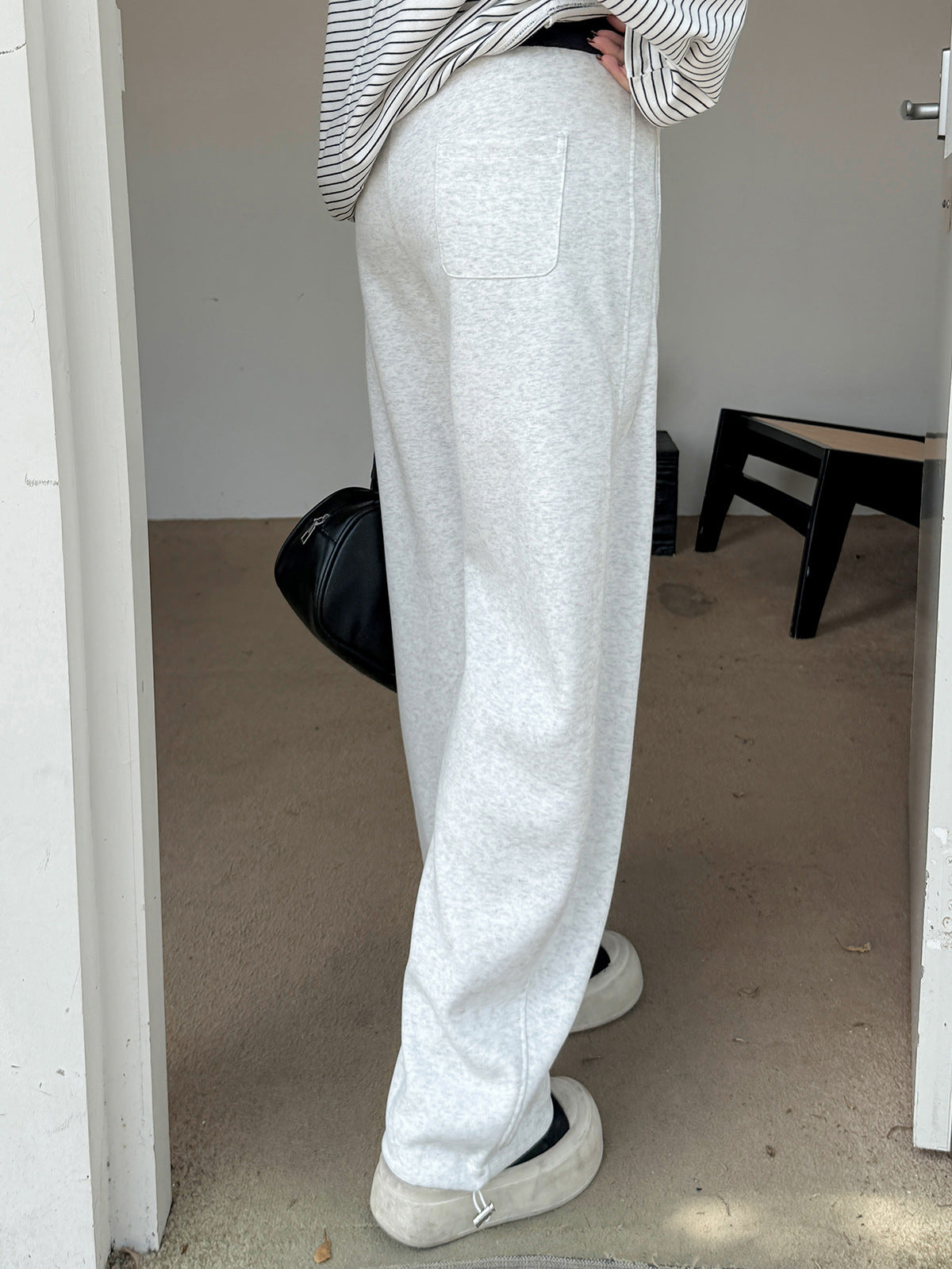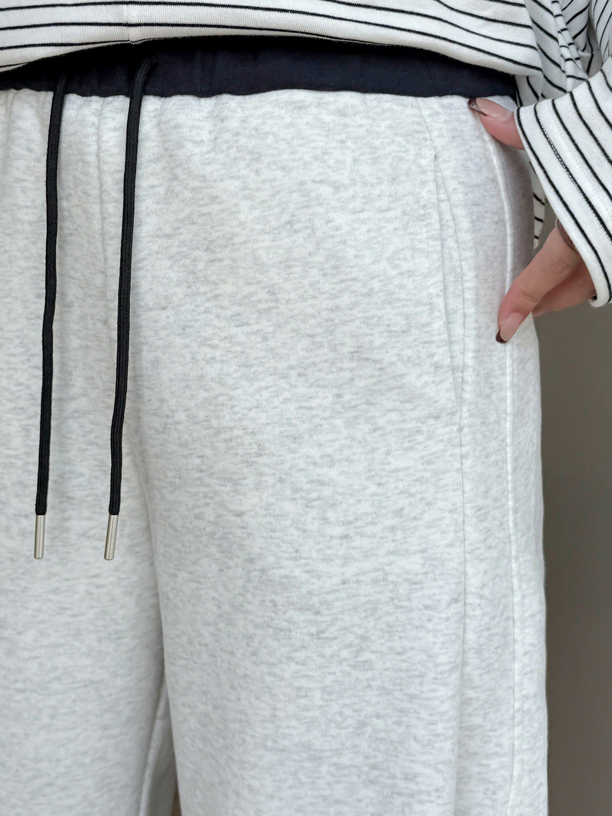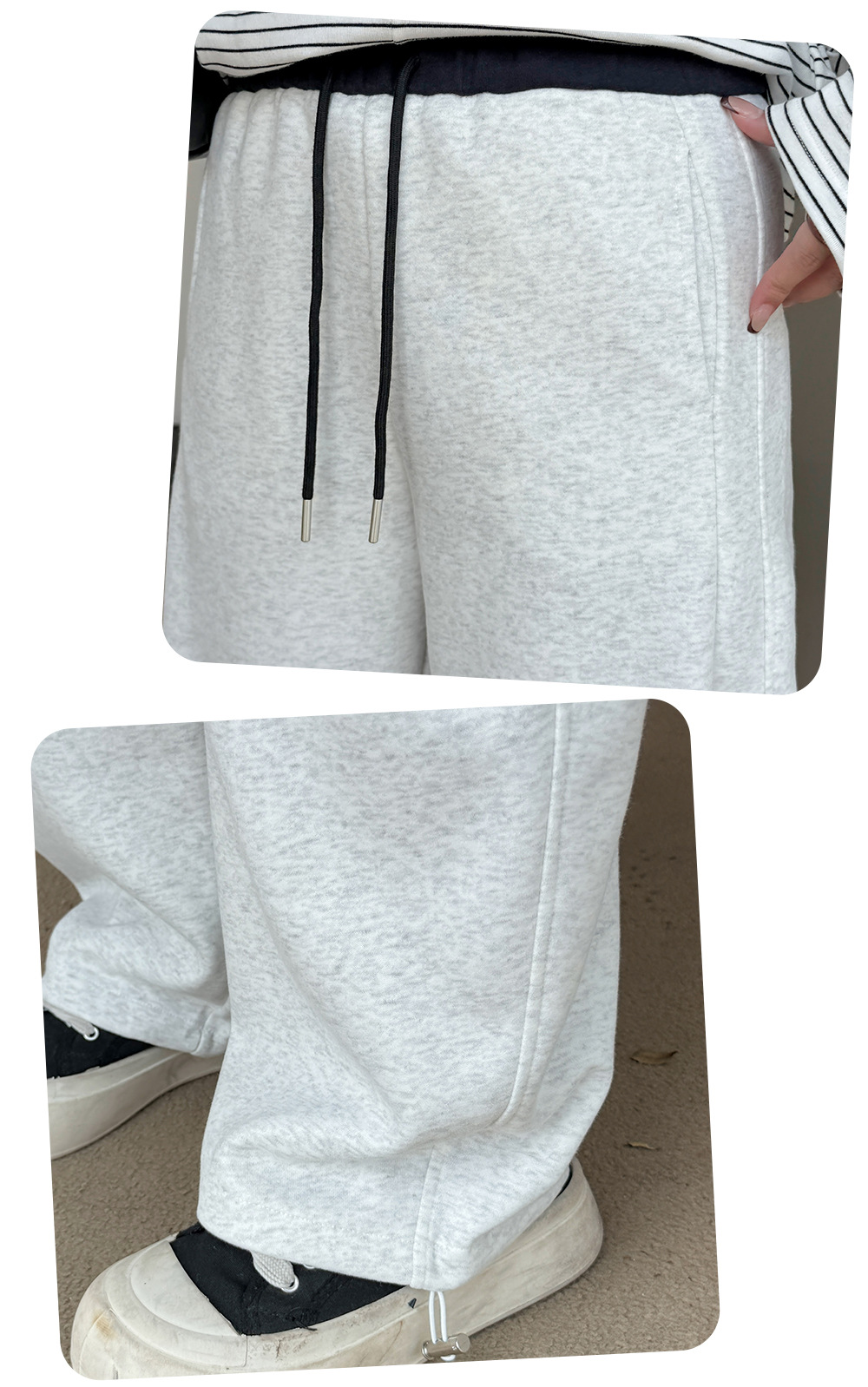 ニットストレートカジュアルパンツは、柔らかく快適なニット複合生地で作られ、厚くてボリュームがあり暖かい履き心地です。ウエスト部分は黒い生地のコントラスのある配色で、メリハリのあるデザインです。フロント、右後ろにポケット、裾に周囲を調節できる伸縮性のあるドローストリングが付いています。脚のラインを美しくカバーしながら、着心地も良く、どんなスタイルにも合わせやすいカジュアルパンツです。