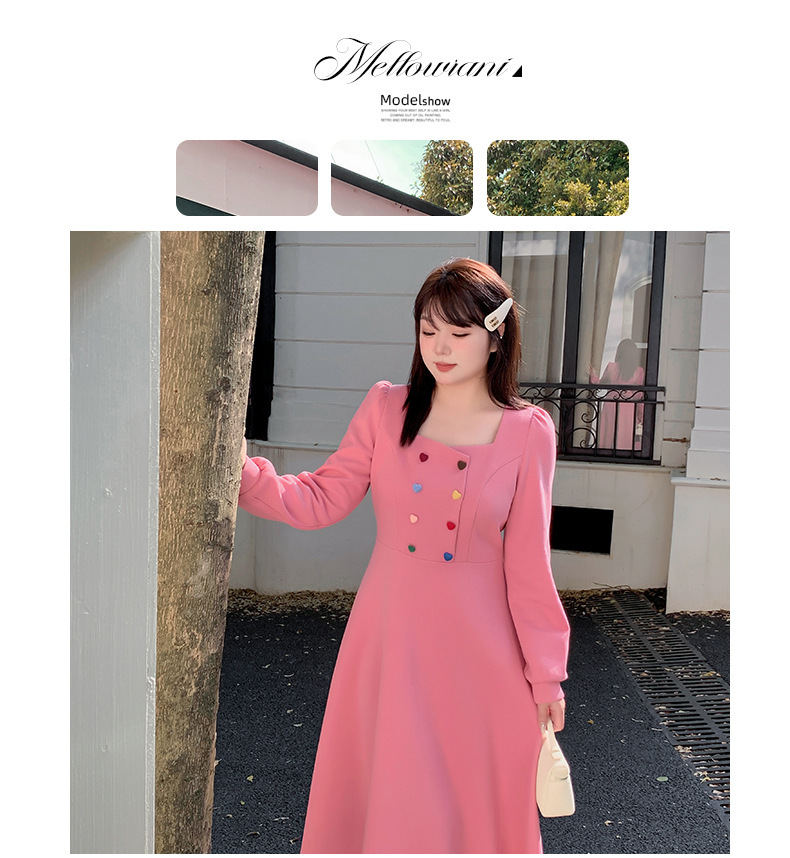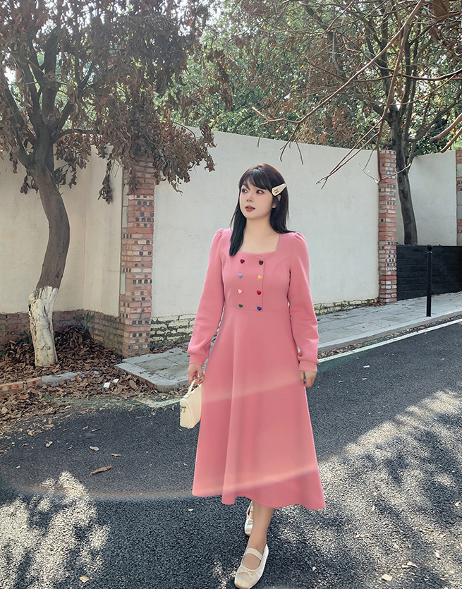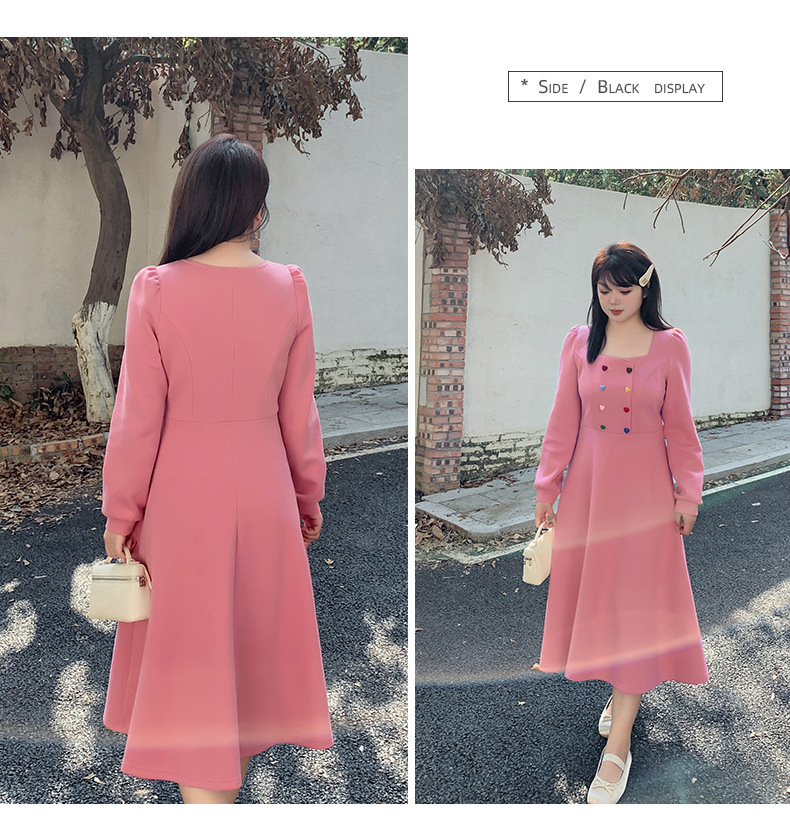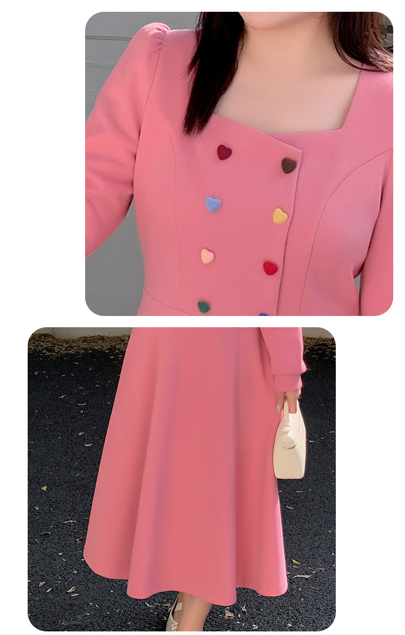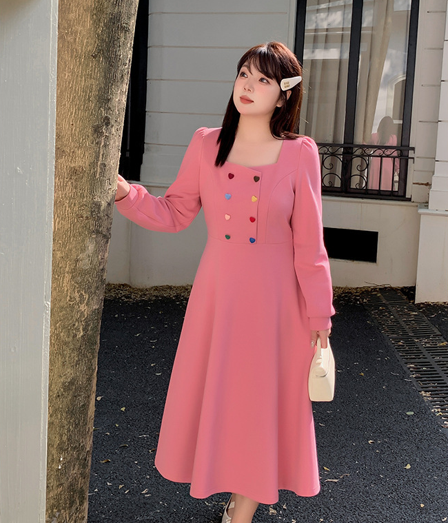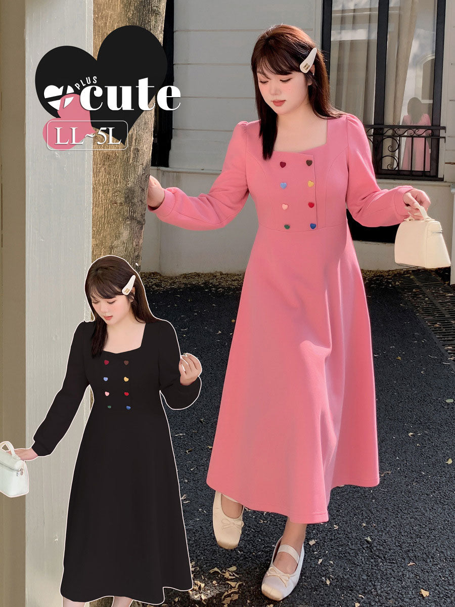 大きいサイズ レディース キャンディーカラーハートボタン付きスクエアネックフレンチワンピース LL 3L 4L 5L