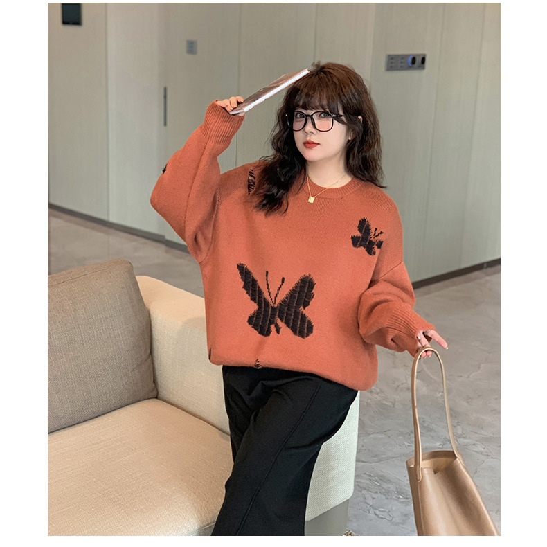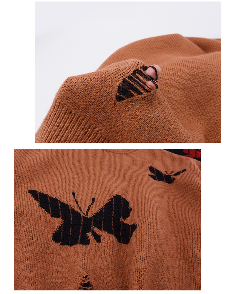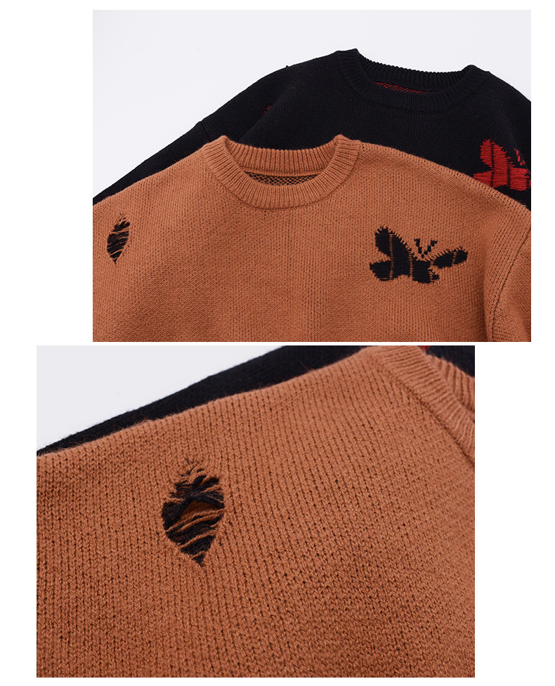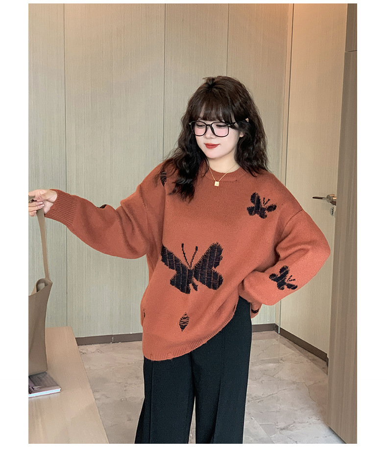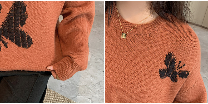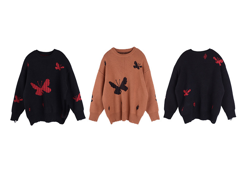 コントラストのあるカラーのビッグバタフライ柄のセーターは、ボディには生き生きとした大きな蝶が織り込まれたデザインです。厚手で柔らかく、非常に伸縮性があります。襟元はラウンドネックで各所に穴が空いている個性的なデザインです。ゆったりとした肩のデザインで着心地のいい暖かいセーターを是非お試しください。