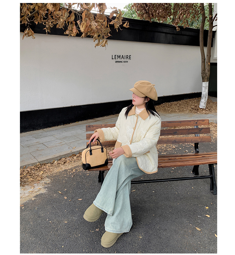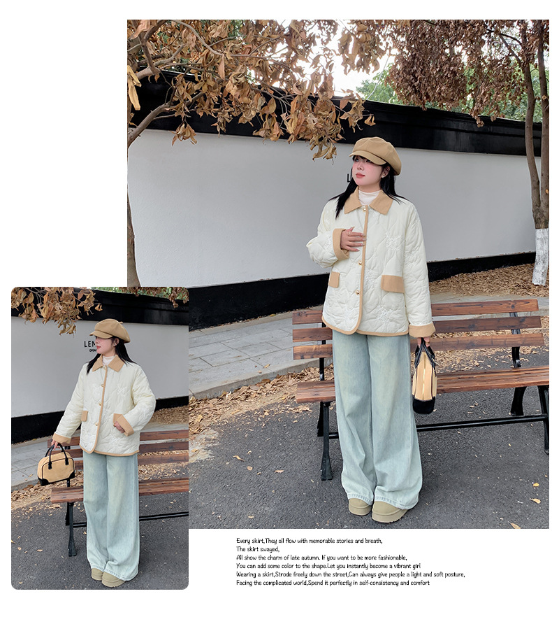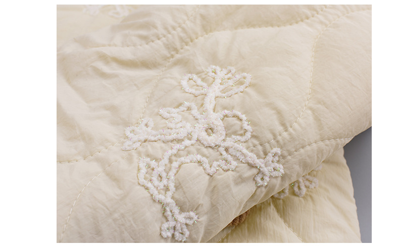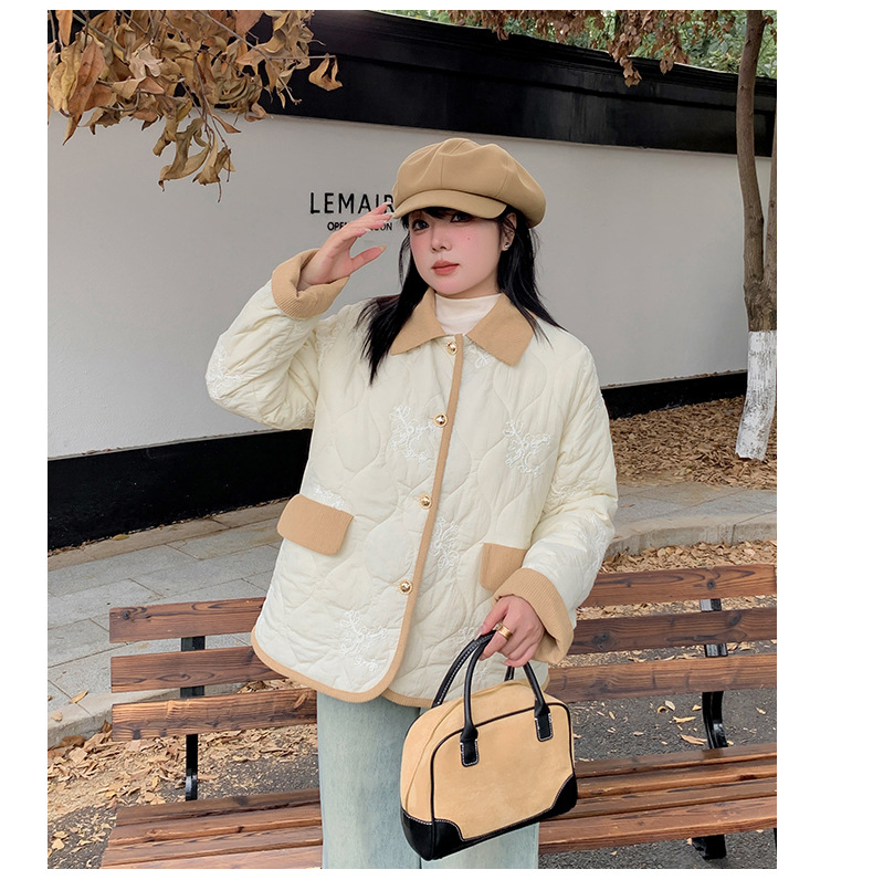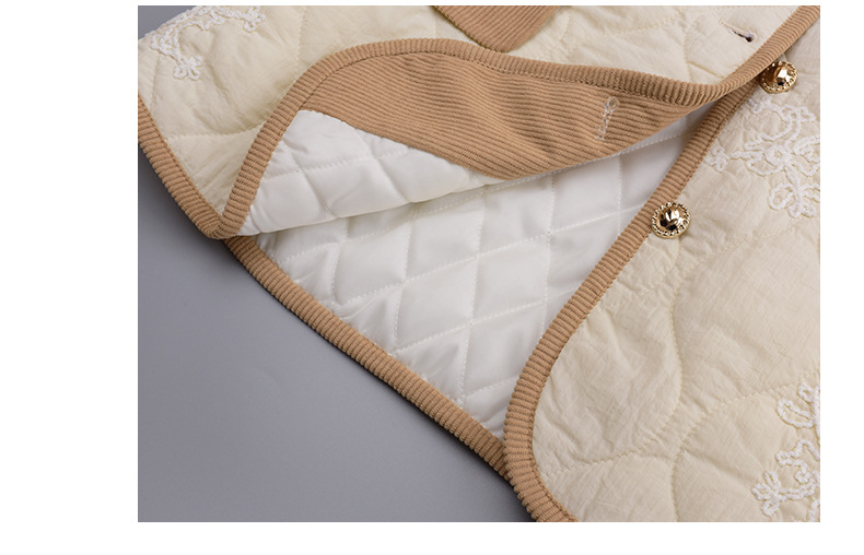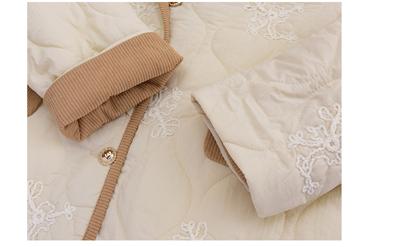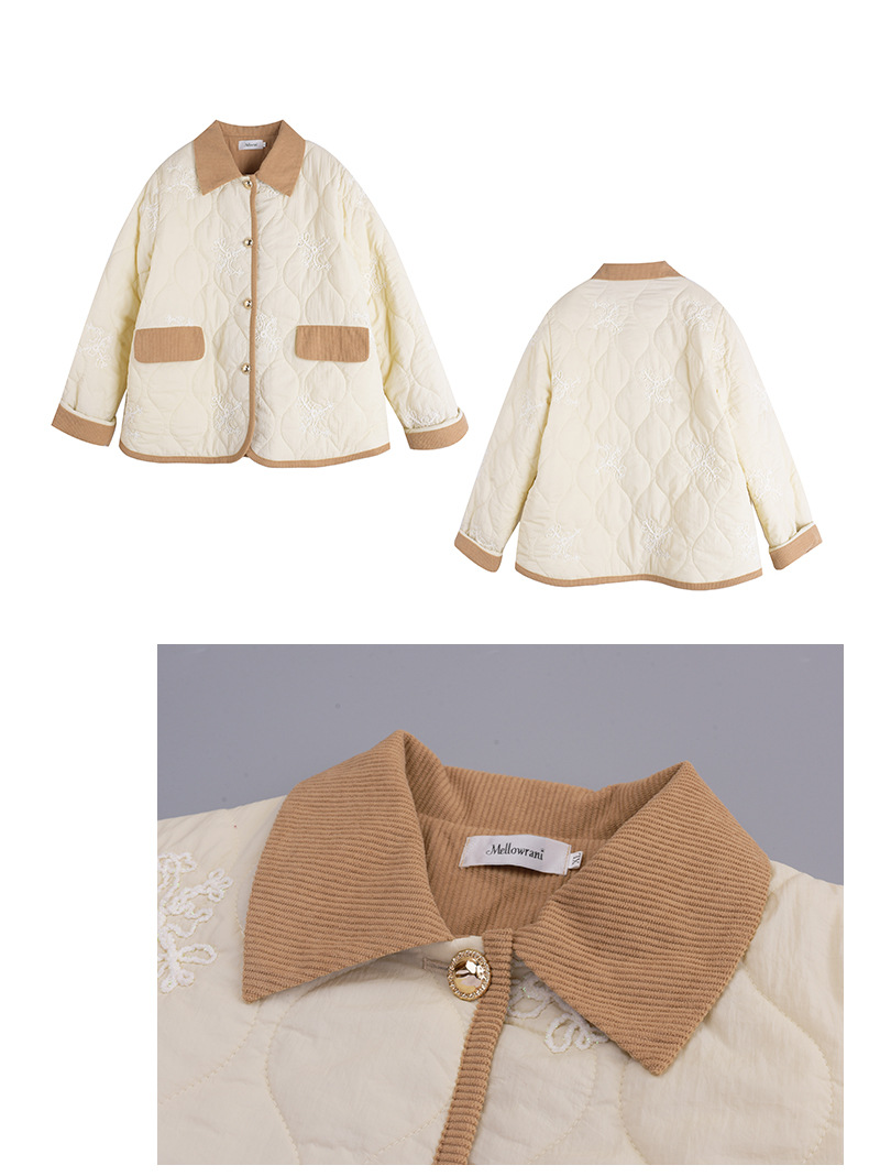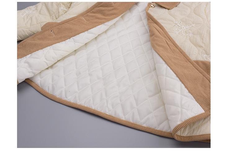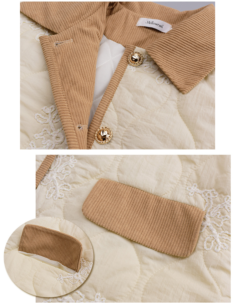 柔らかくて軽い、通勤やレジャーに適したキルティングジャケットは、生地は表面にキルティングとオシャレな刺繍が施されており、ライトブラウンのコーデュロイ生地をつなぎ合わせたデザインです。フロントのボタンを外して着ることができ、スリップポケットが2つ付いており、袖口をロールアップしてコーデュロイを見せるさりげないオシャレが魅力的です。暖かくて柔らかい快適で着心地のいいアウターを是非お試しください。