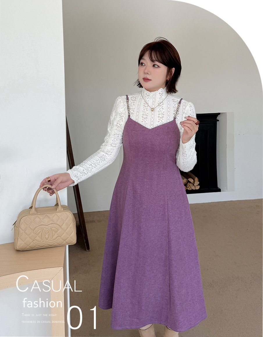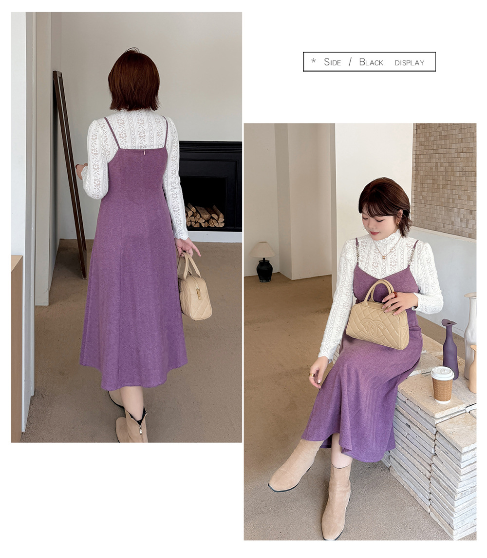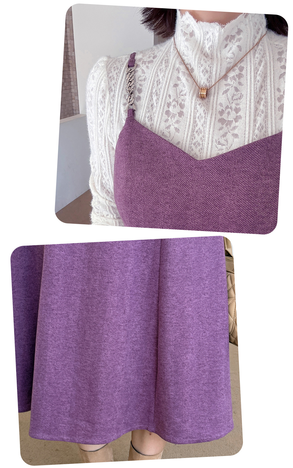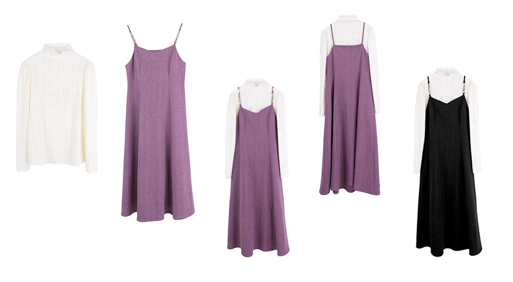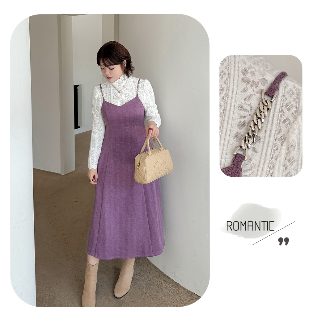 レーストップスとスリップワンピースのツーピースセットは、春、秋、冬にぴったりで、組み合わせても別々でも最適です。インナートップスは豪華なレースを使用し、スリップワンピースは美しい質感とドレープ性のある薄手のウール風生地で作られており、暖かく快適な着心地です。伸縮性のあるレーストップスはセミハイカラーで快適な着心地を提供し、袖口までレースの模様が施されています。スリップワンピースのショルダーストラップはメタルバックルで継ぎ合わせ、後ろには隠しファスナーが付いています。ウエストを絞って裾をフリルにしたミディアム丈のシルエットは、通勤にも普段着にも最適で、魅力的な一着です。