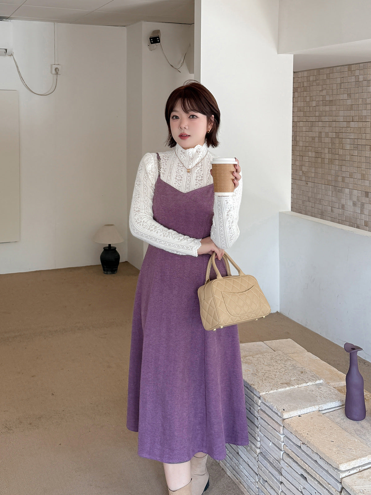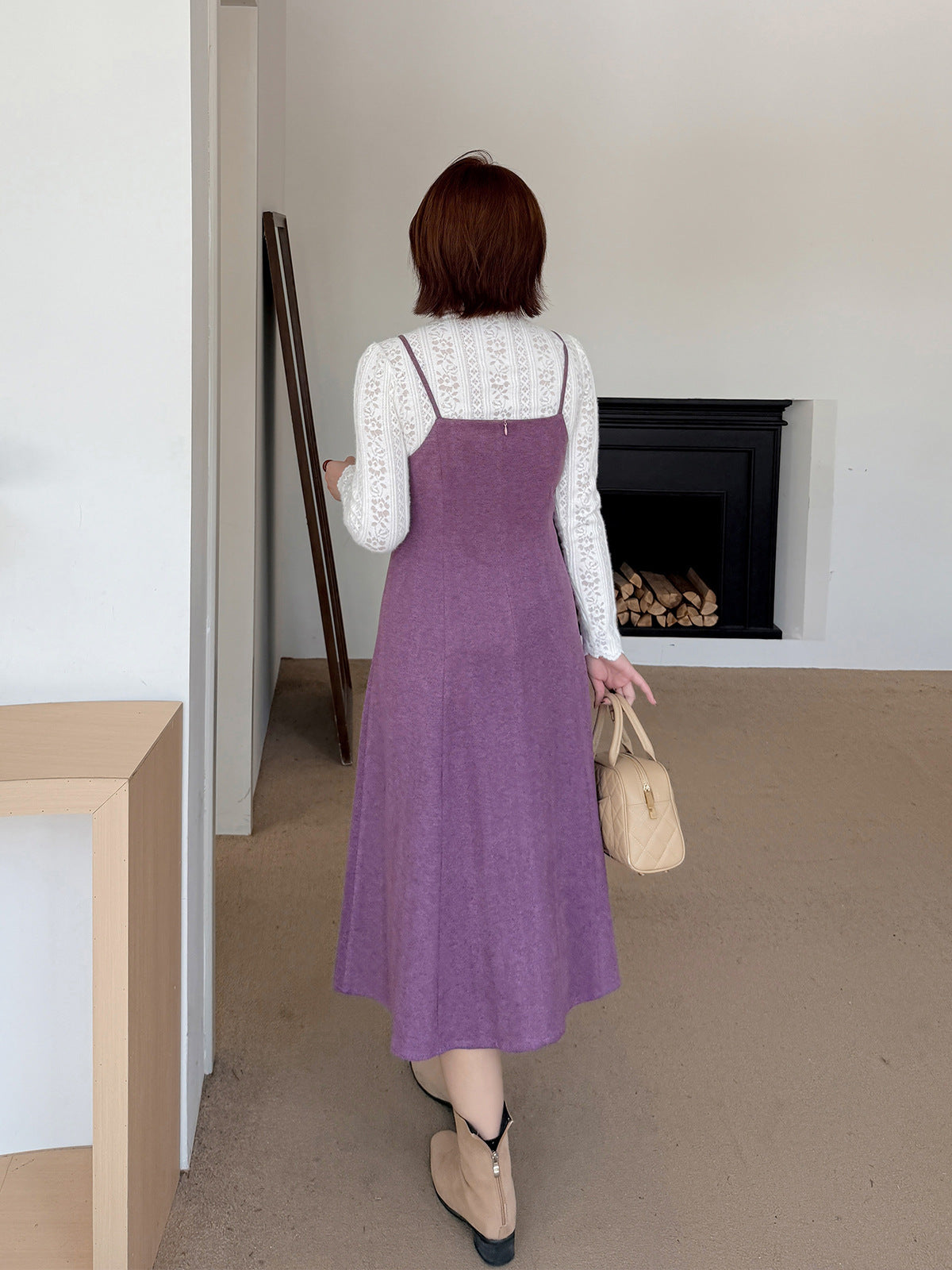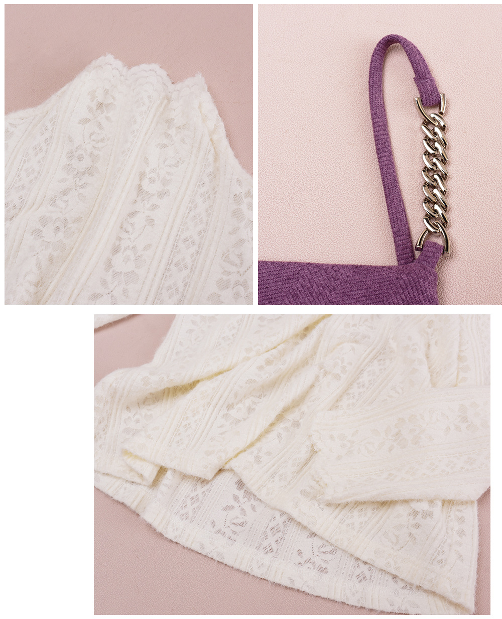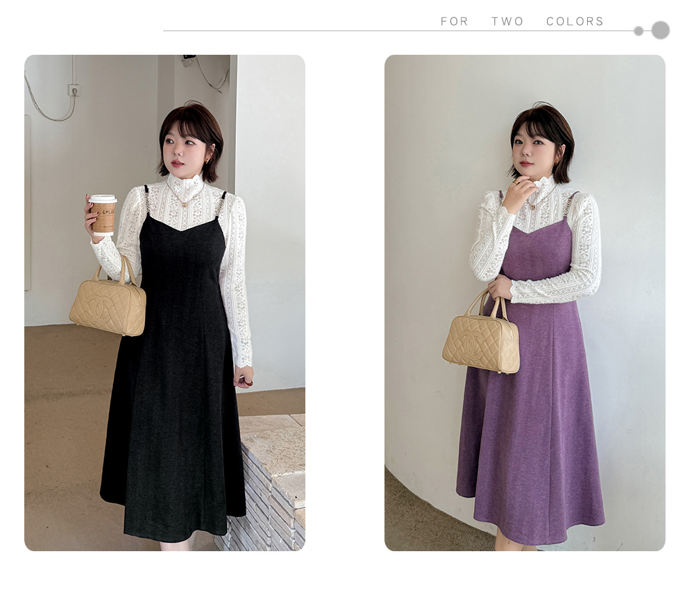 レーストップスとスリップワンピースのツーピースセットは、春、秋、冬にぴったりで、組み合わせても別々でも最適です。インナートップスは豪華なレースを使用し、スリップワンピースは美しい質感とドレープ性のある薄手のウール風生地で作られており、暖かく快適な着心地です。伸縮性のあるレーストップスはセミハイカラーで快適な着心地を提供し、袖口までレースの模様が施されています。スリップワンピースのショルダーストラップはメタルバックルで継ぎ合わせ、後ろには隠しファスナーが付いています。ウエストを絞って裾をフリルにしたミディアム丈のシルエットは、通勤にも普段着にも最適で、魅力的な一着です。
