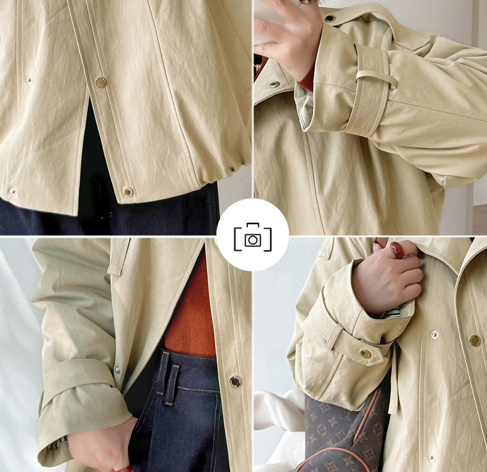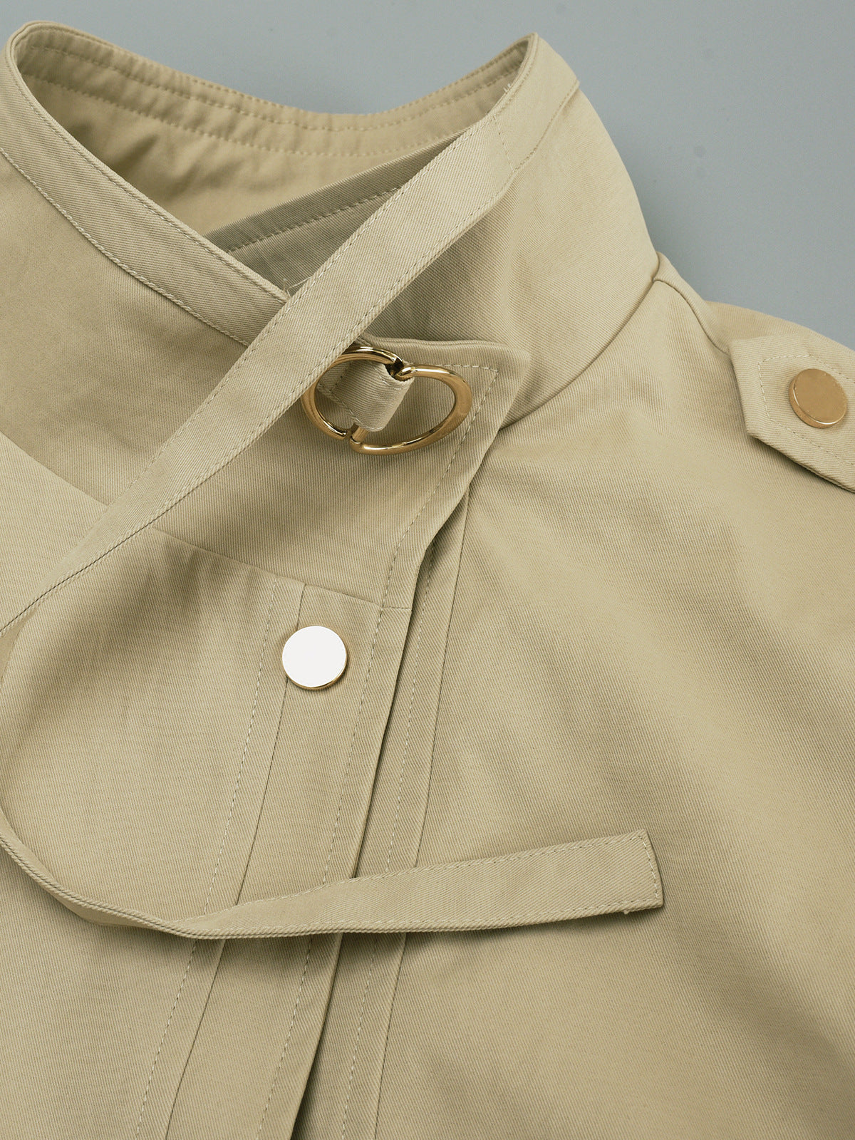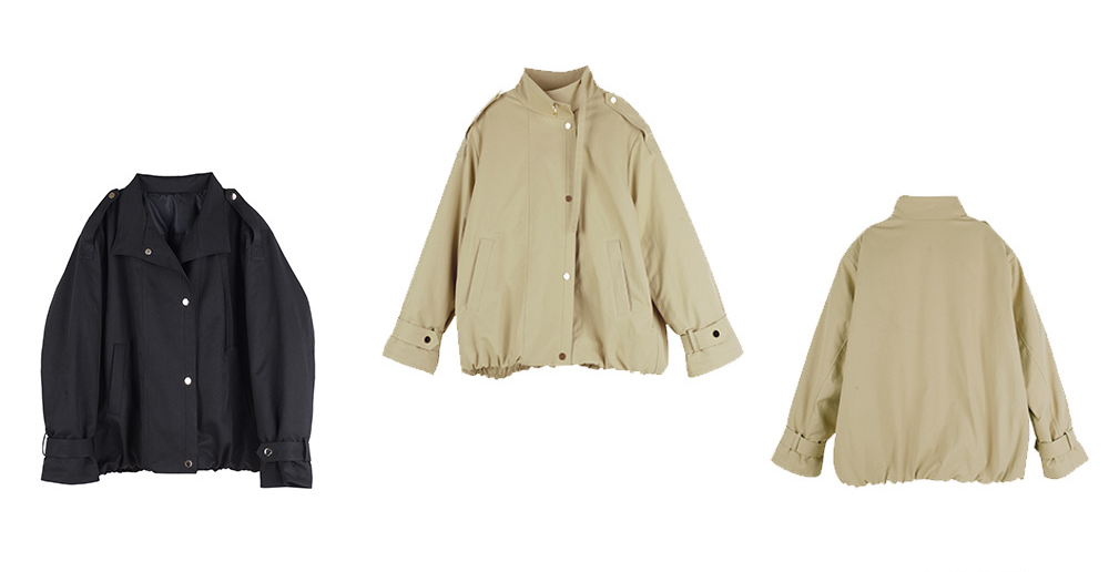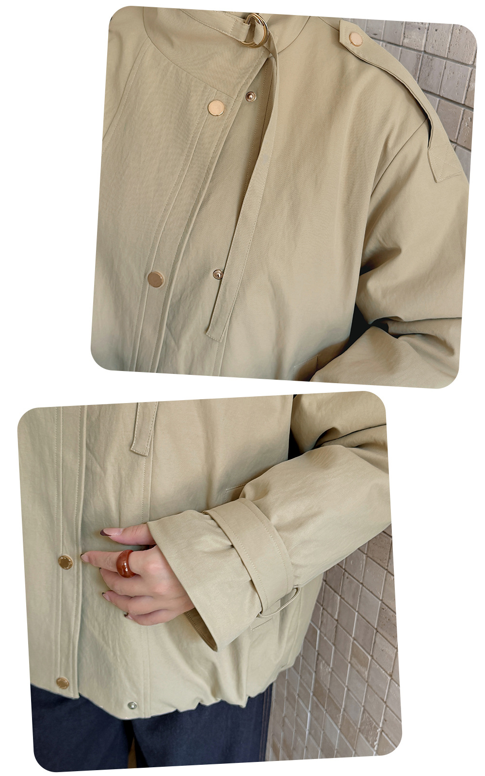 ワークウェアスタイルのカジュアルコットンジャケットは、織りツイル生地+キルティングコットン裏地で作られています。機能的で暖かく、快適な着心地です。折りたたみ可能な小さなスタンドカラーです。襟にはバックルとネックストラップが施され、フロントポケットが2つ、内ポケットが1つ、肩にはボタンタブ、袖口は取り外し可能です。フロントはメタルスナップボタンで着脱も簡単です。実用的でスタイリッシュなジャケットを是非お試しください。