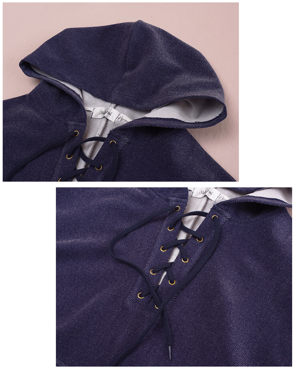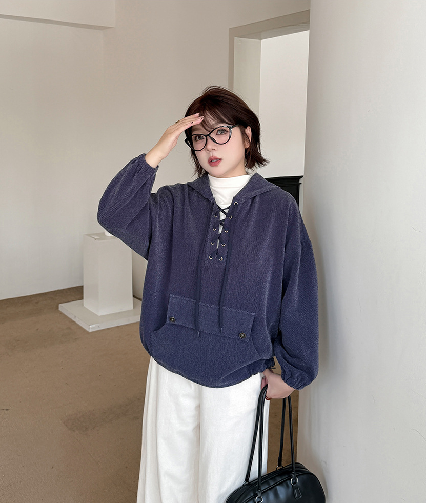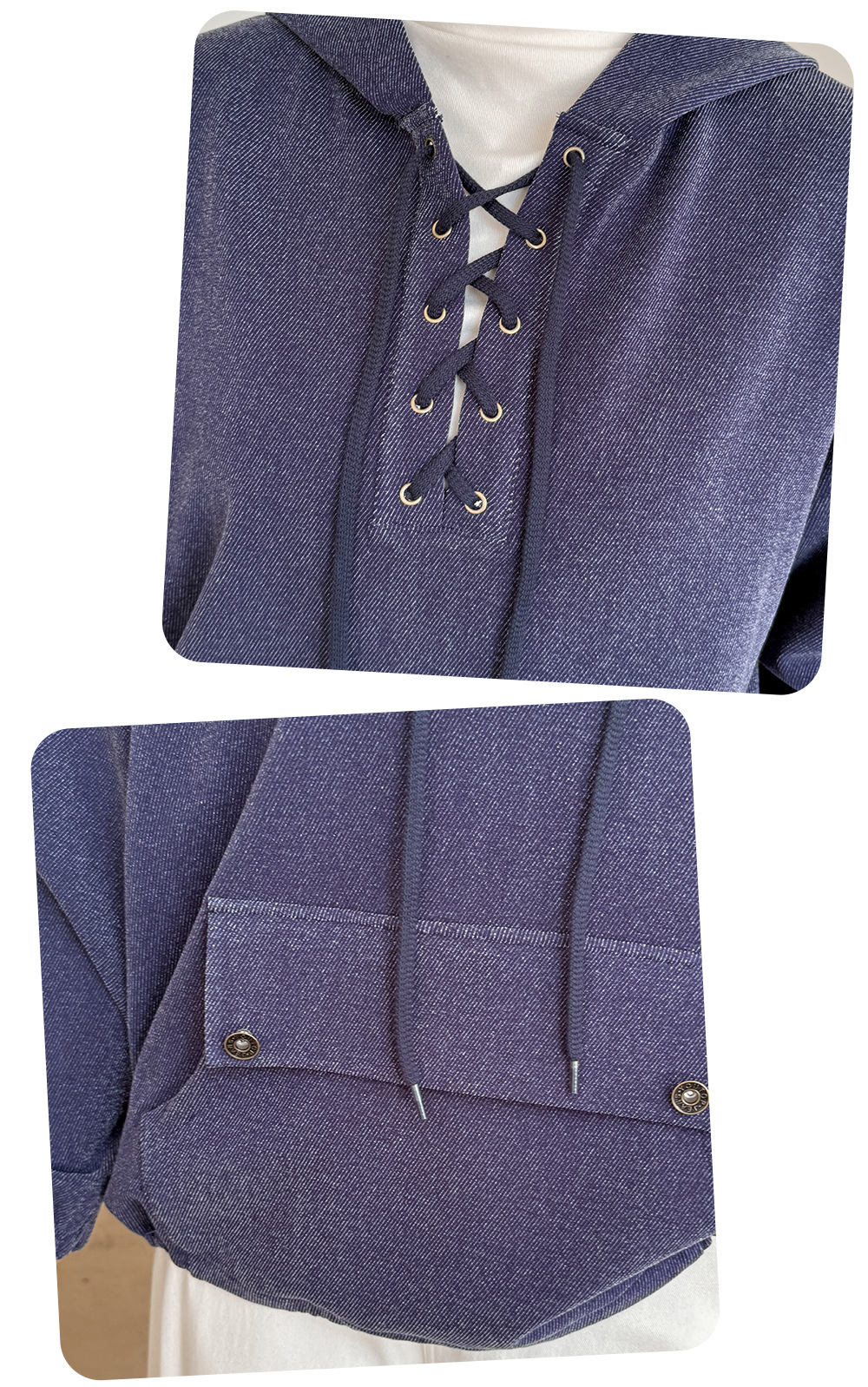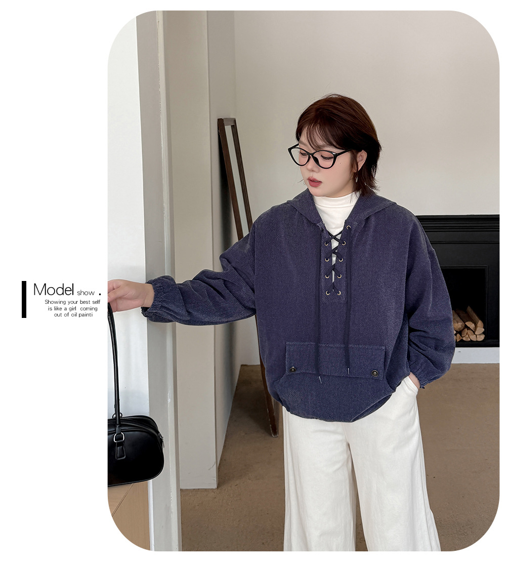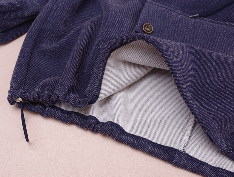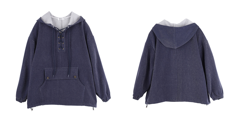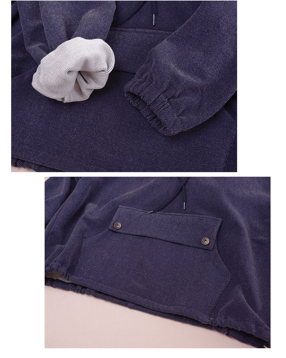 厚手のフード付きドローストリングスウェットシャツは、表面にデニムのような斜めの凹凸がある厚手のニットフェイクデニム生地を使用しています。柔らかく暖かく、伸縮性があり、しっかりとした着心地です。フードは紐付きのダブルアイレットネックラインのカジュアルデザインです。フロントには大きなカンガルーポケットが付いています。ゆったりとしたドロップショルダーの袖口です。裾の両サイドに調整バックルが付いており、裾周りを調整できます。
