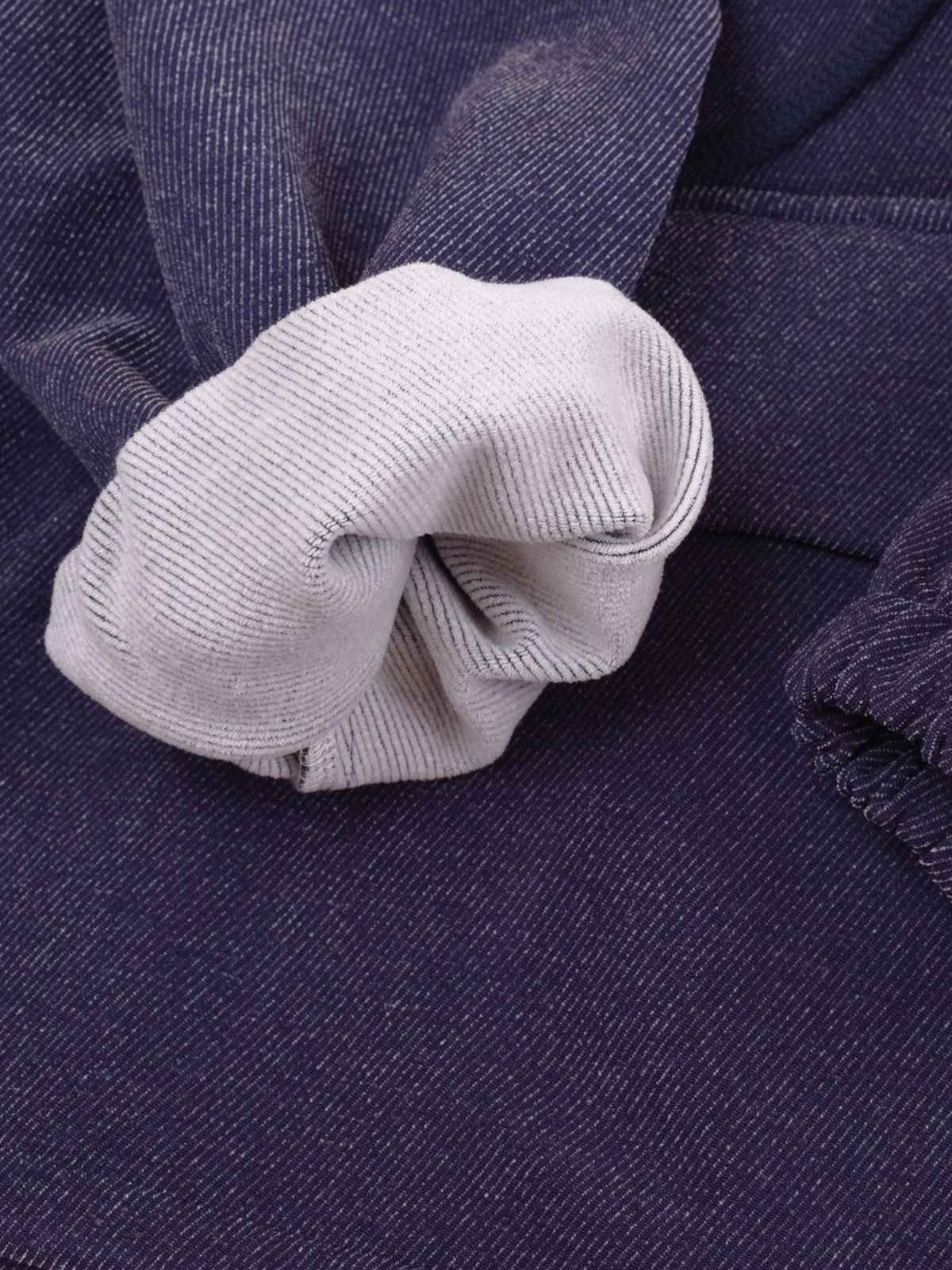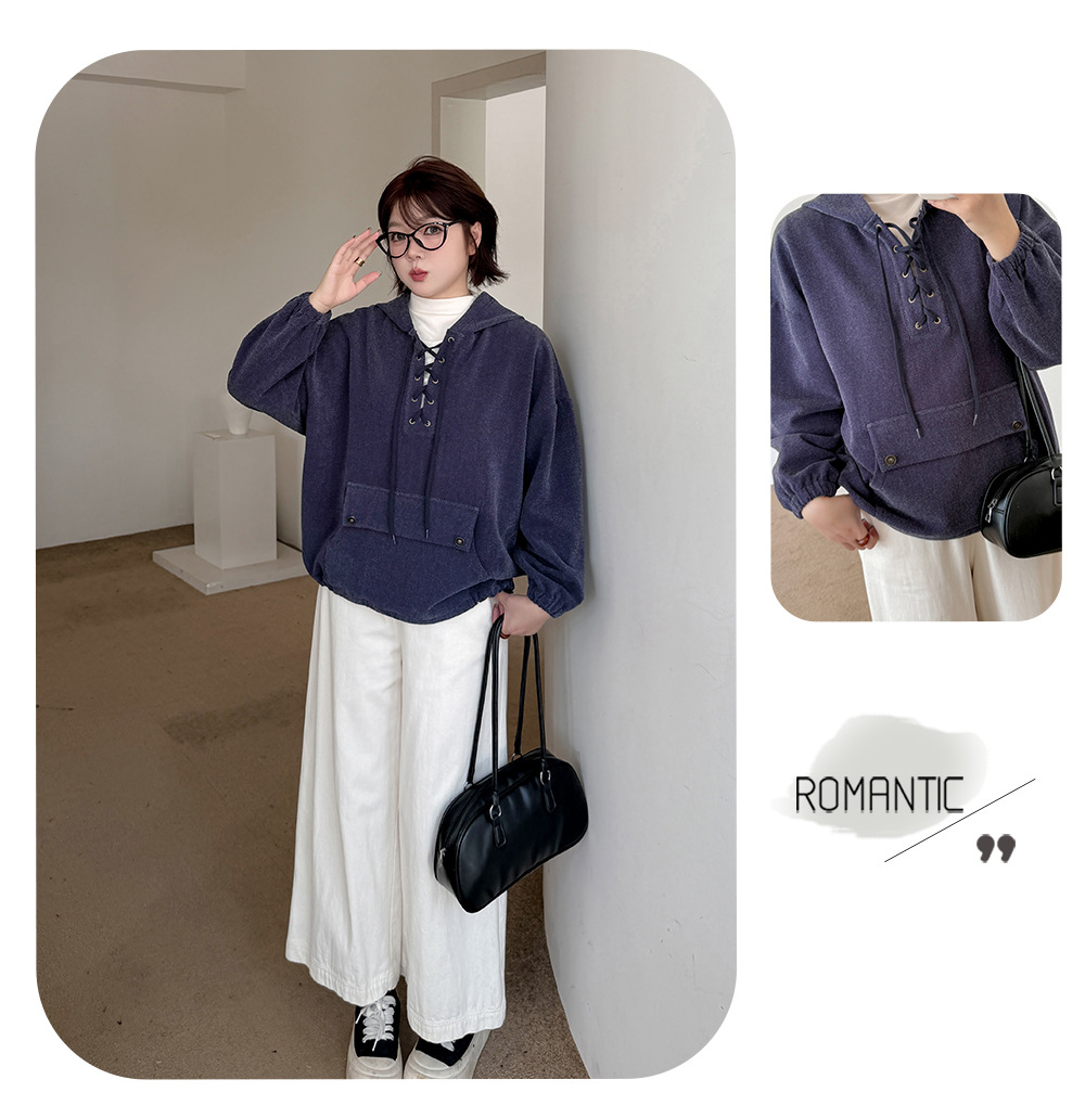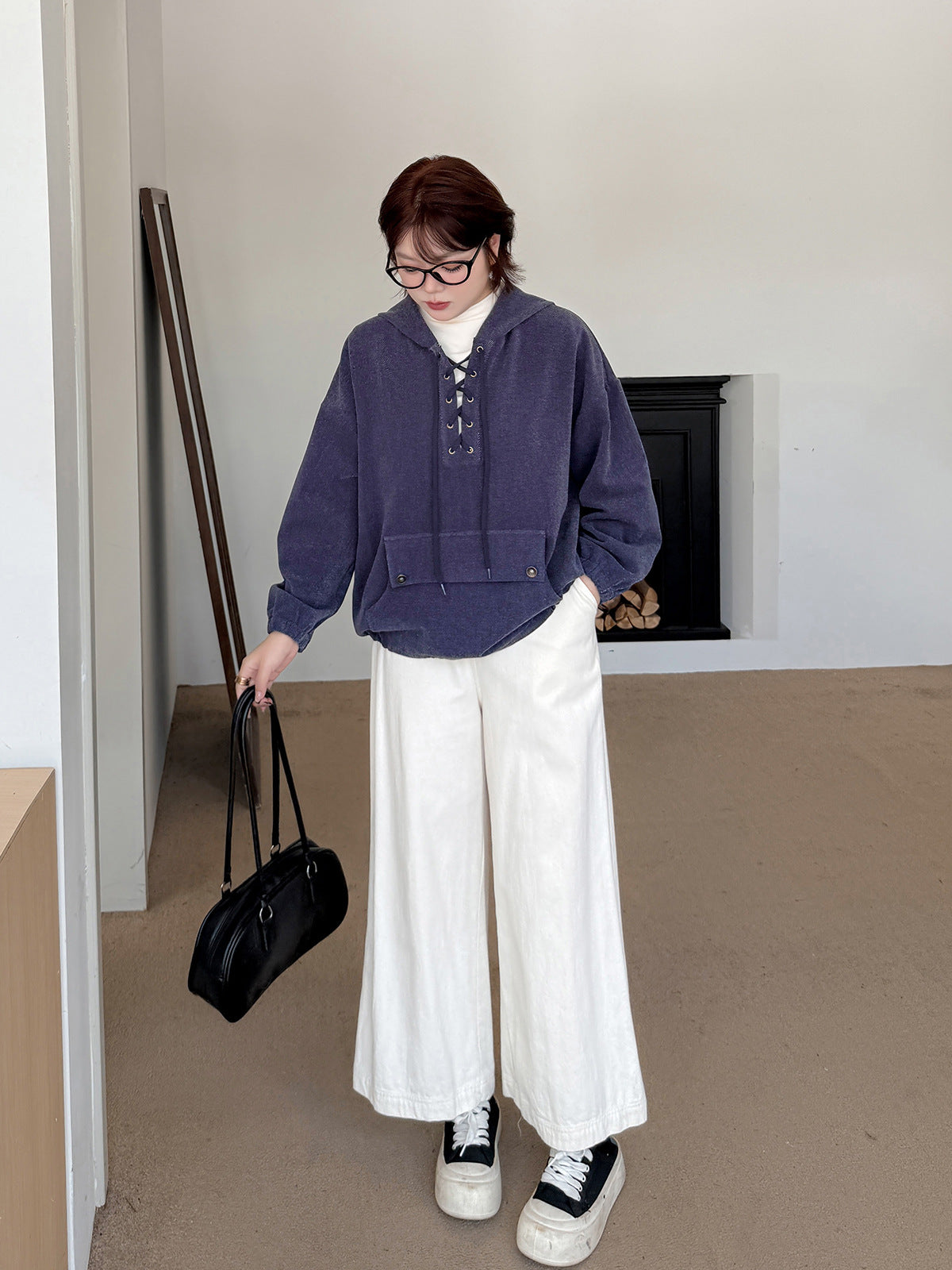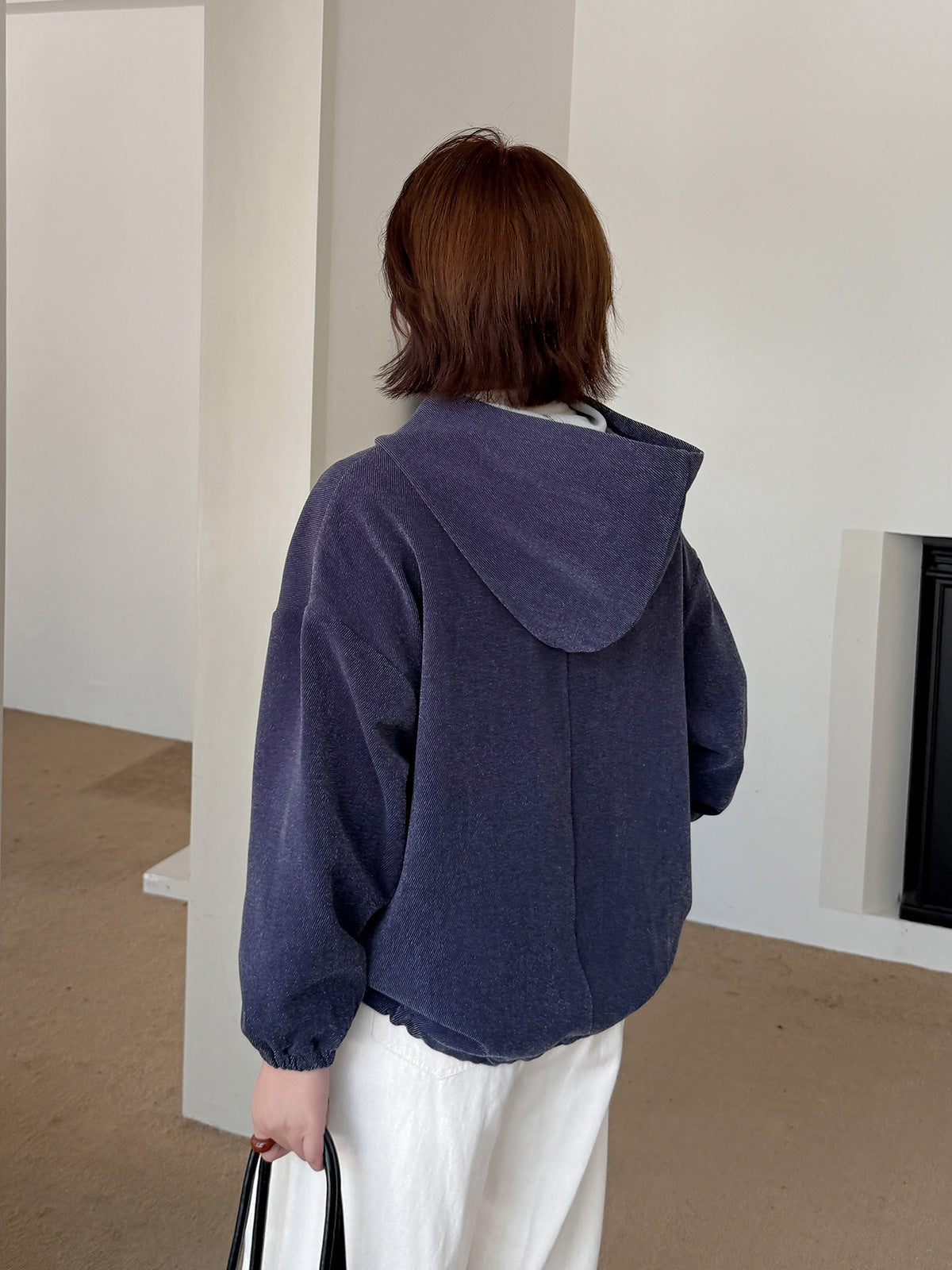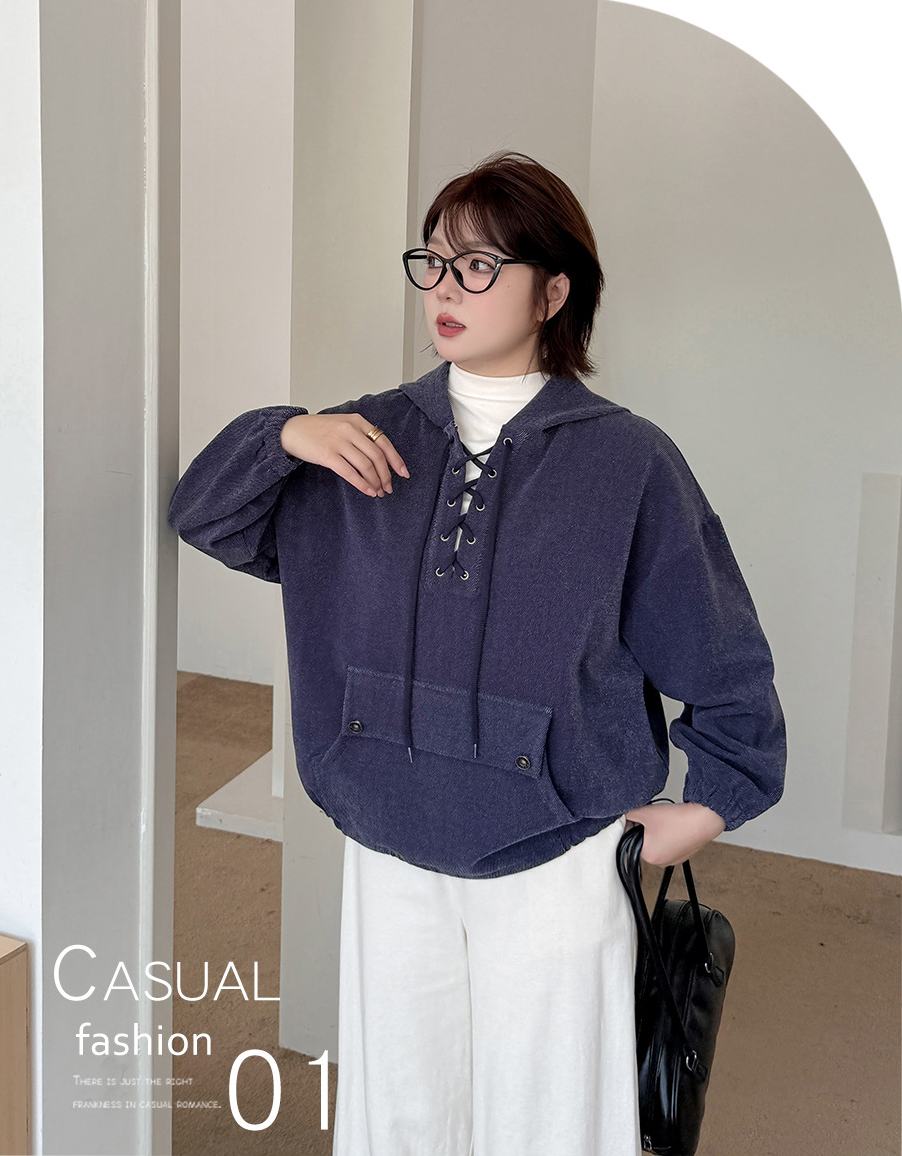 厚手のフード付きドローストリングスウェットシャツは、表面にデニムのような斜めの凹凸がある厚手のニットフェイクデニム生地を使用しています。柔らかく暖かく、伸縮性があり、しっかりとした着心地です。フードは紐付きのダブルアイレットネックラインのカジュアルデザインです。フロントには大きなカンガルーポケットが付いています。ゆったりとしたドロップショルダーの袖口です。裾の両サイドに調整バックルが付いており、裾周りを調整できます。