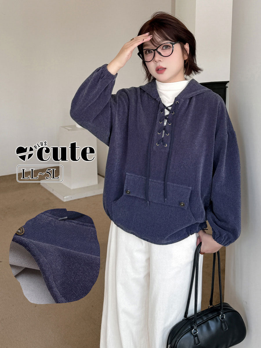 大きいサイズ レディース フード付きドローストリング厚手スウェットパーカー LL 3L 4L 5L