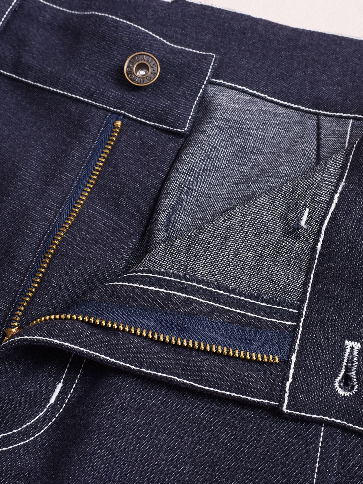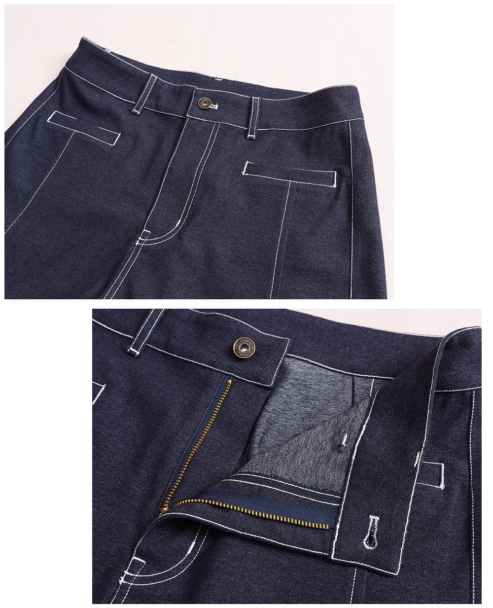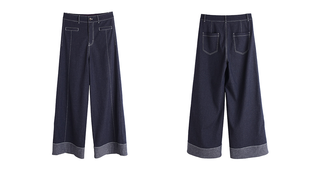 フェイクデニムワイドレッグパンツで使用されている生地は、柔らかく起毛したフェイクデニム生地です。暖かみのある起毛感と、斜めにすると程よい弾力があり、手に持った時の重みもしっかり感じられます。コントラストステッチ、フロントジッパー、スナップ留めが特徴的なデザインです。外側に広がるワイドなデザインを採用。ゆったりとしたフィット感がありながらもシャープなシルエットを保ち、洗練された見た目と暖かさを両立しています。