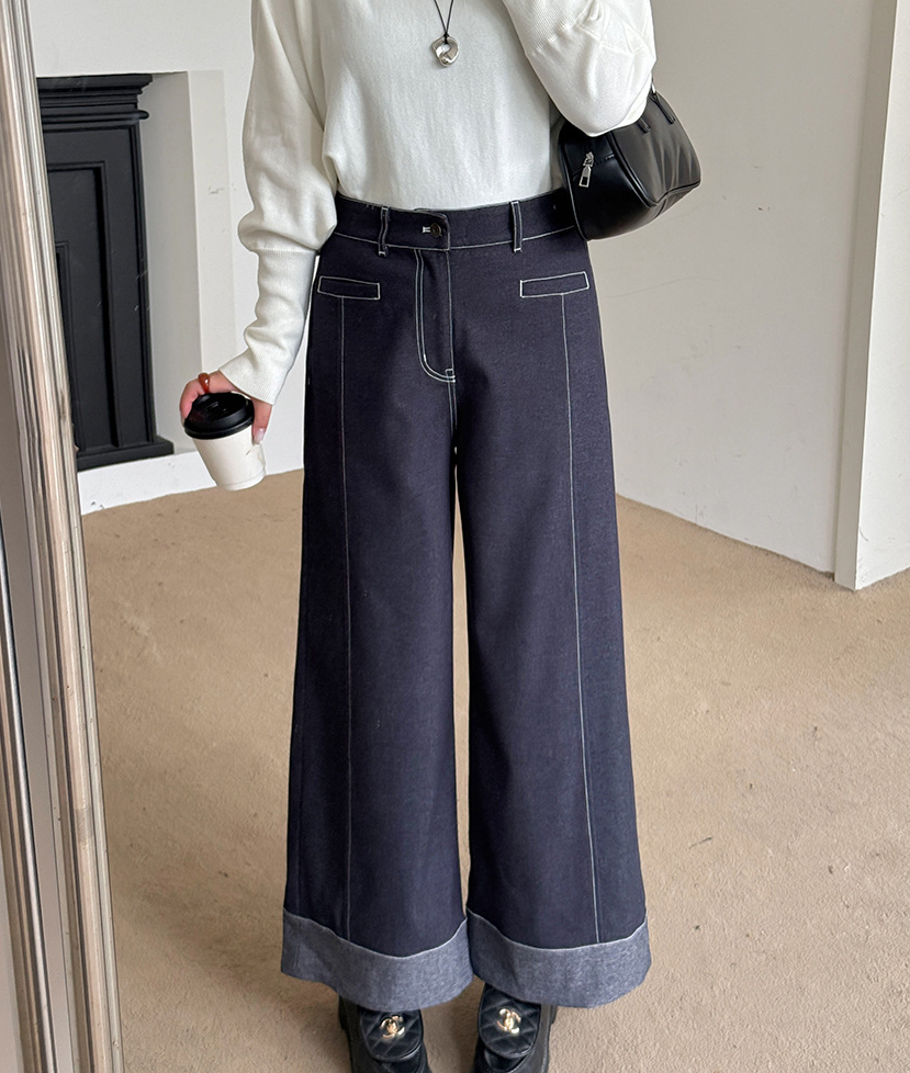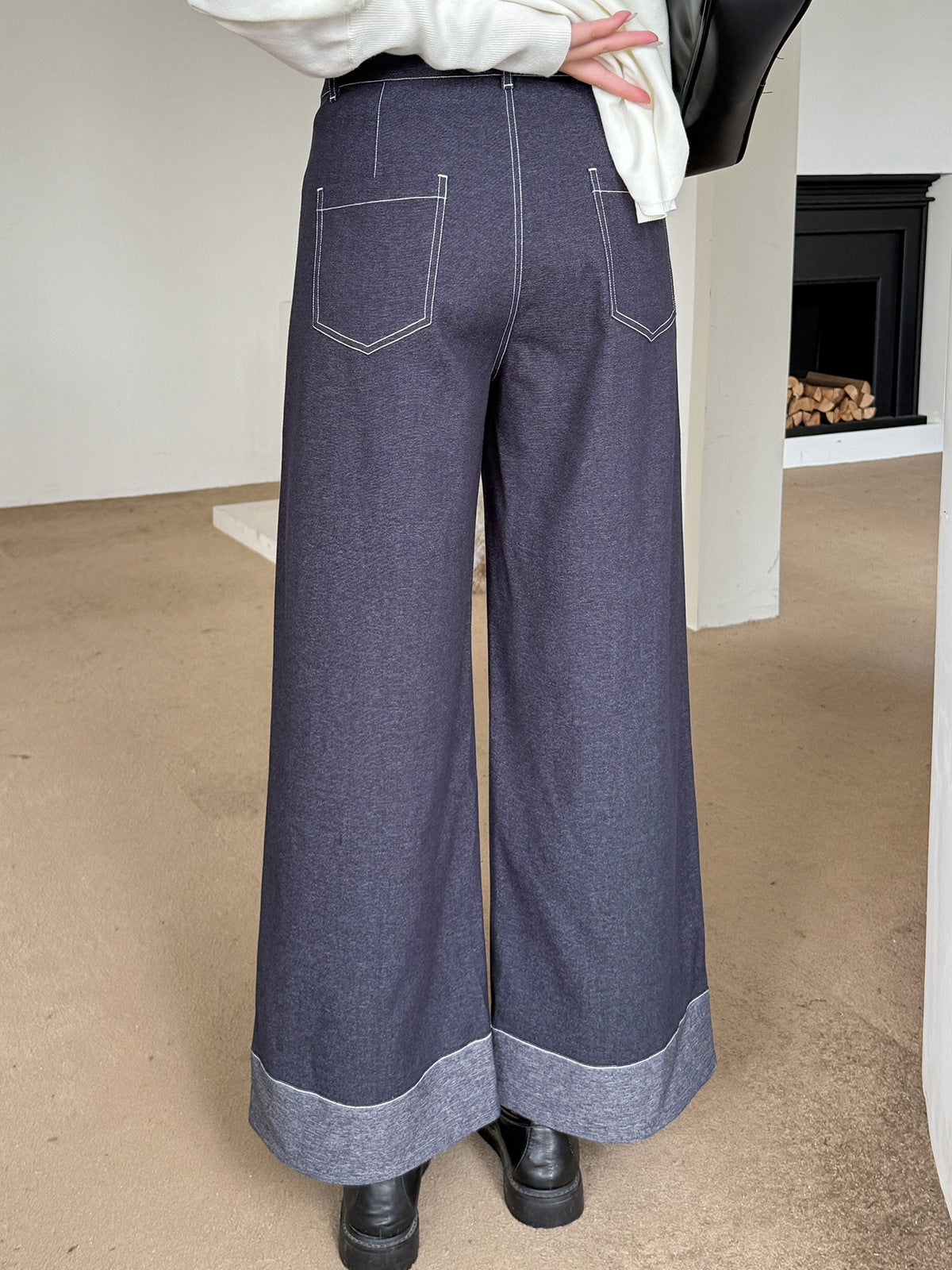 大きいサイズ レディース フェイクデニム折り返しワイドレッグパンツ LL 3L 4L 5L