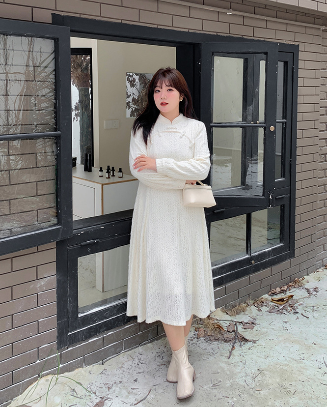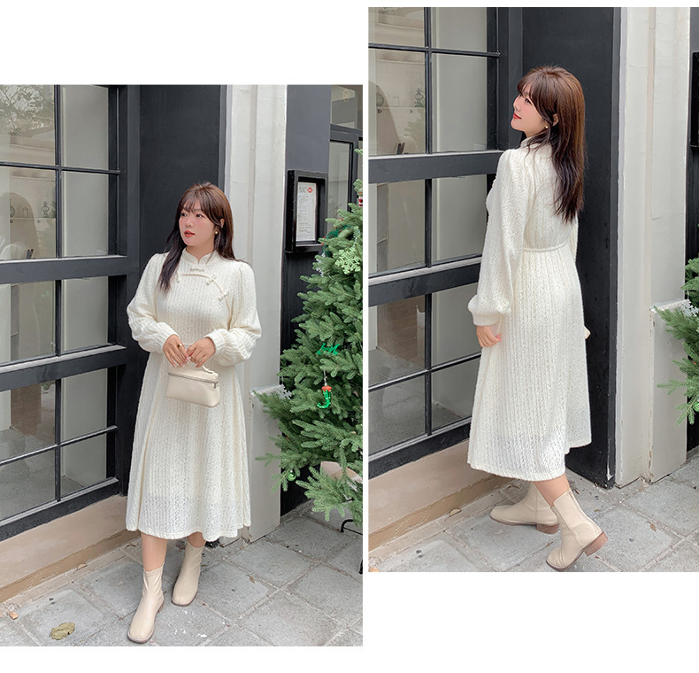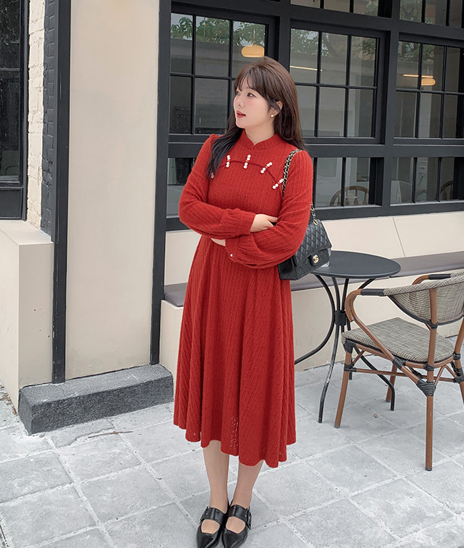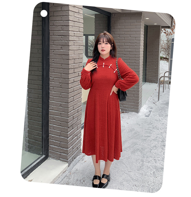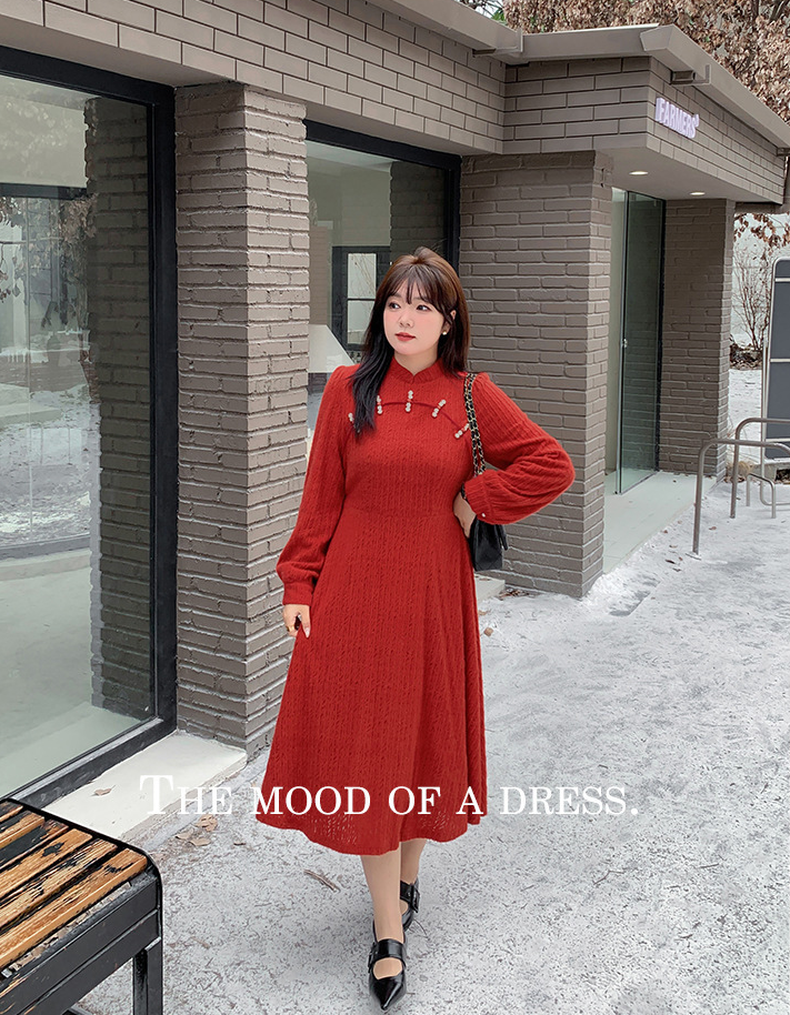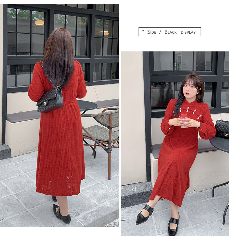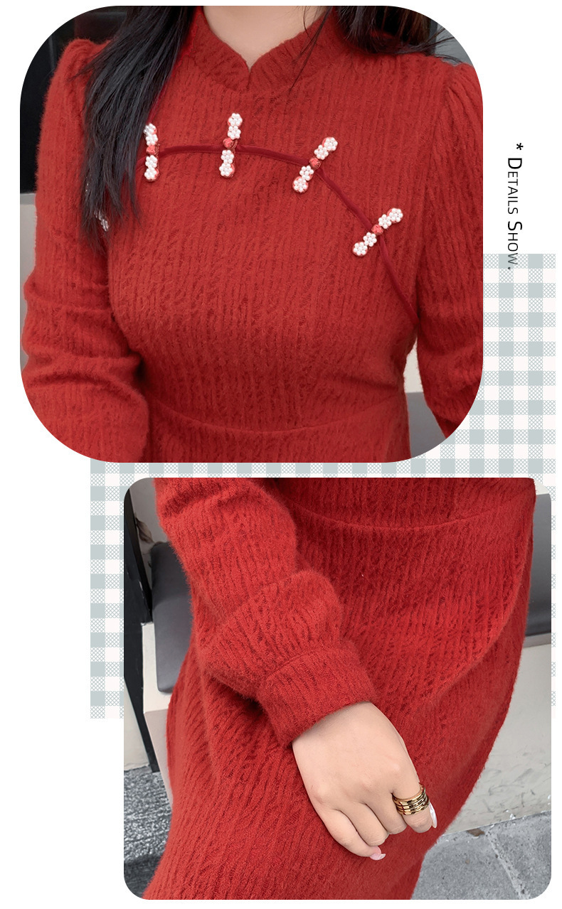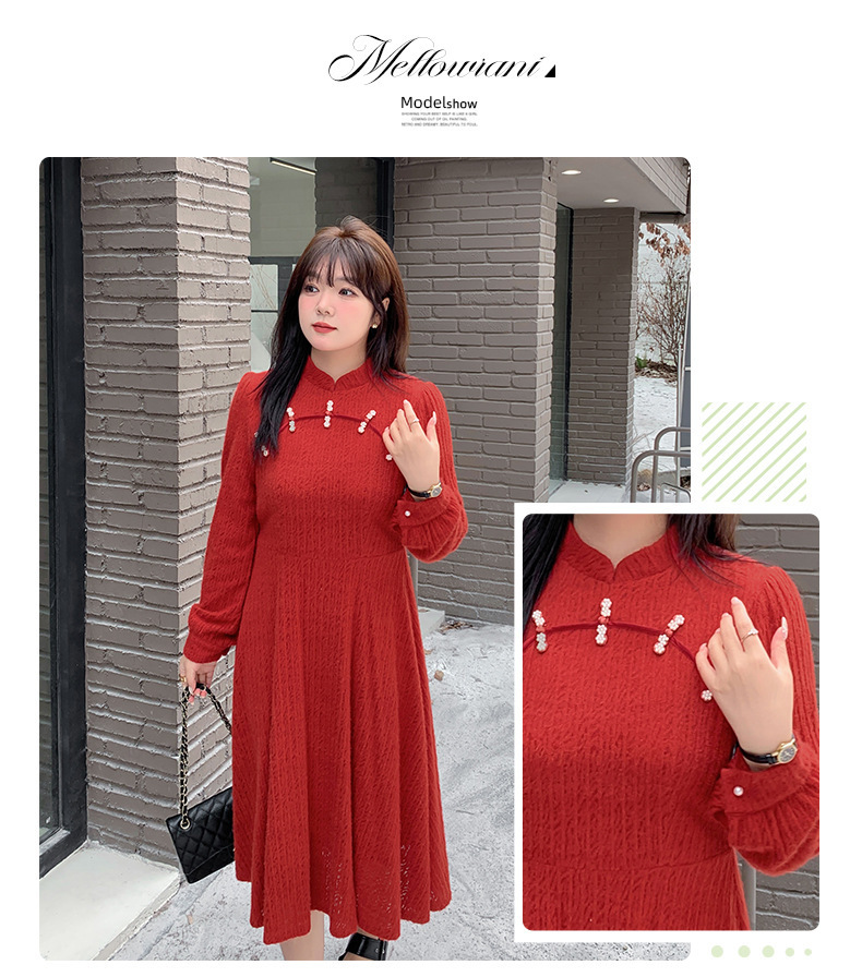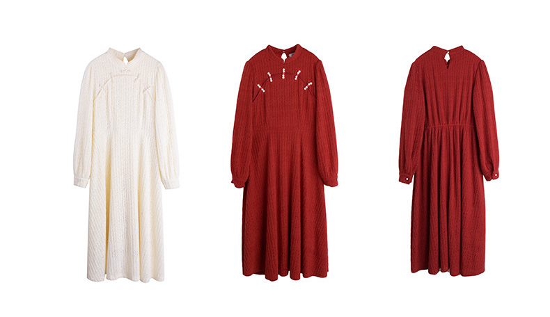 チャイナ風のレトロなレースワンピースは、厚みのある豪華なレース生地で作られており、伸縮性があり、柔らかくしっかりとしています。ボディと袖に薄いフリースの裏地が付いているので、秋と冬の着用に最適です。小さめのスタンドカラーで、後ろに開きがありビーズボタンが付いています。花柄のビーズボタンで飾られた胸元の丸みのあるトリムが、洗練されたエレガントな雰囲気を醸し出します。ボタン付きの袖口、伸縮性のあるウエスト、そしてエレガントで洗練されたフレアスカートのシルエットが目を引く、女性らしいワンピースを是非お試しください。