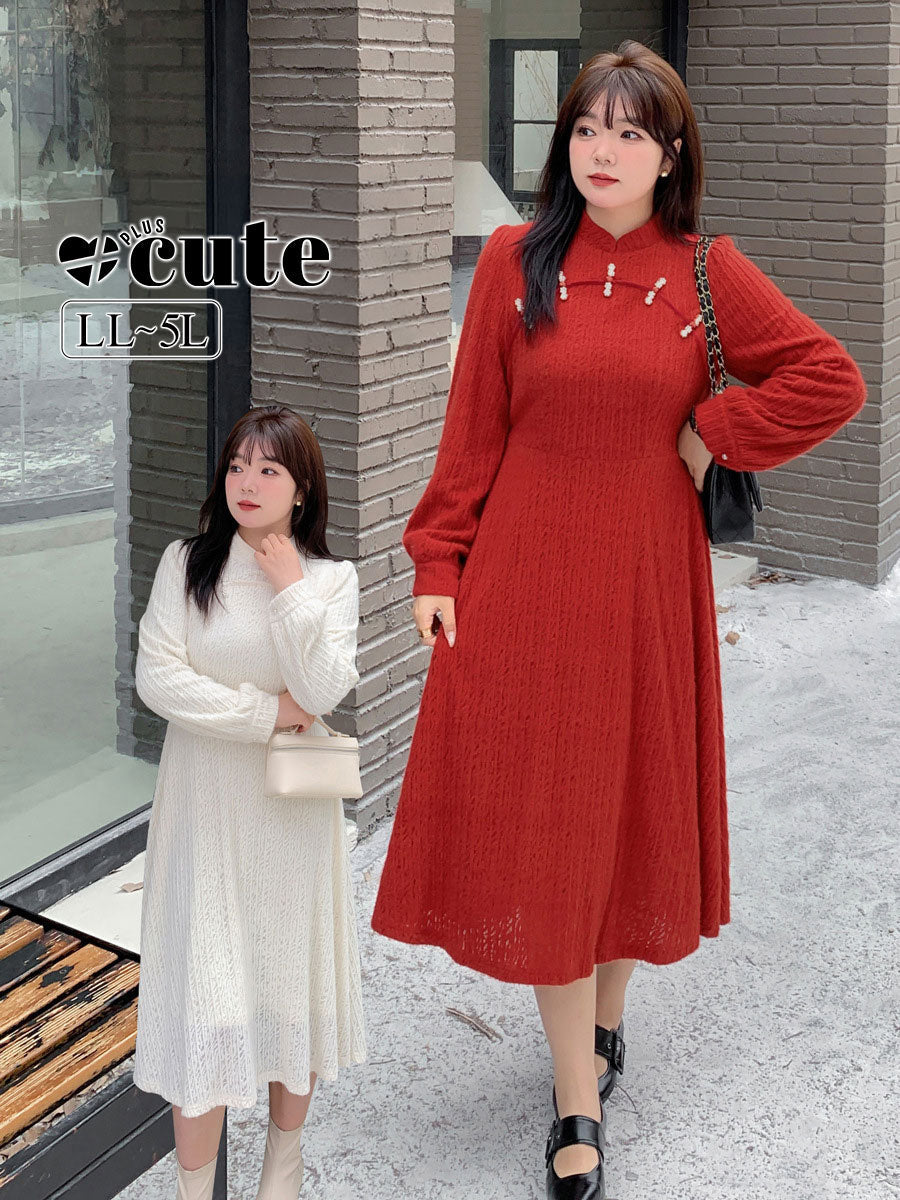 大きいサイズ レディース チャイナ風レトロ花柄ビーズボタンレースワンピース LL 3L 4L 5L