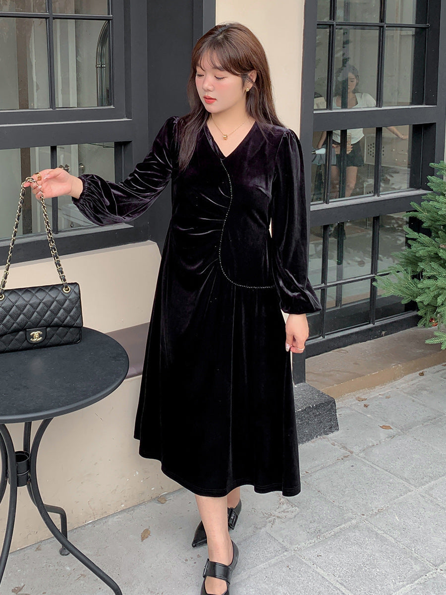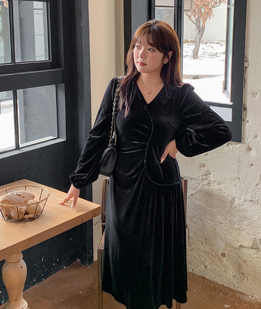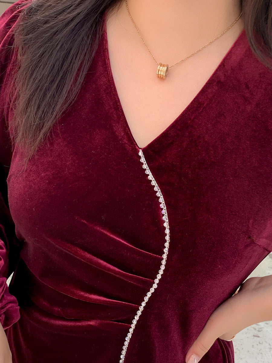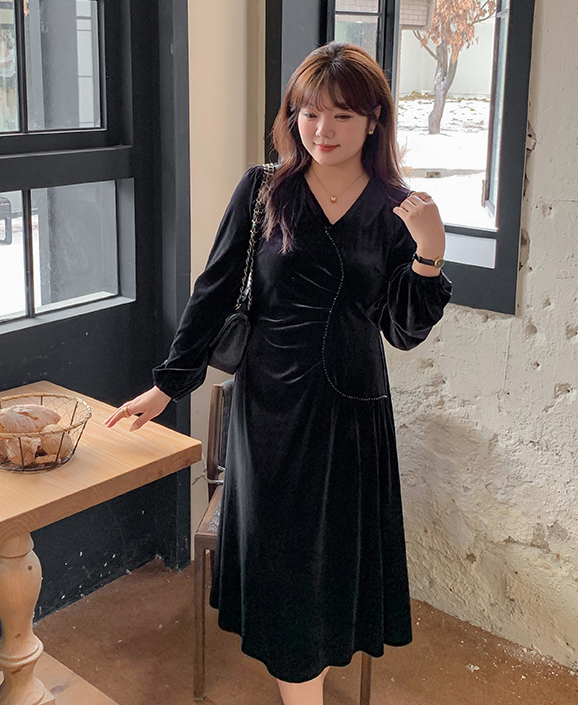 大きいサイズ レディース Vネックラインストーン装飾エレガントベルベットワンピース LL 3L 4L 5L
