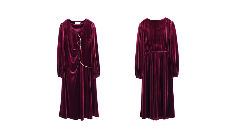 エレガントフィットのベルベットワンピースは、光沢と伸縮性に優れた韓国産ベルベット素材を採用。シルクのように滑らかで、美しくドレープし、動くたびに魅力を放ちます。Vネックと立体的なカット、フロントセンターシームのプリーツデザインに繊細なラインストーンをあしらうことで、優美な曲線を描き出しています。伸縮性のある袖口とウエストが、快適なフィット感と締め付け感を実現。丁寧に仕立てられたワンピースは、お祝いの席や、普段の通勤にも着用できる一着です。
