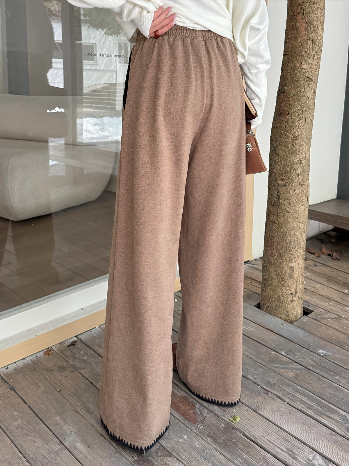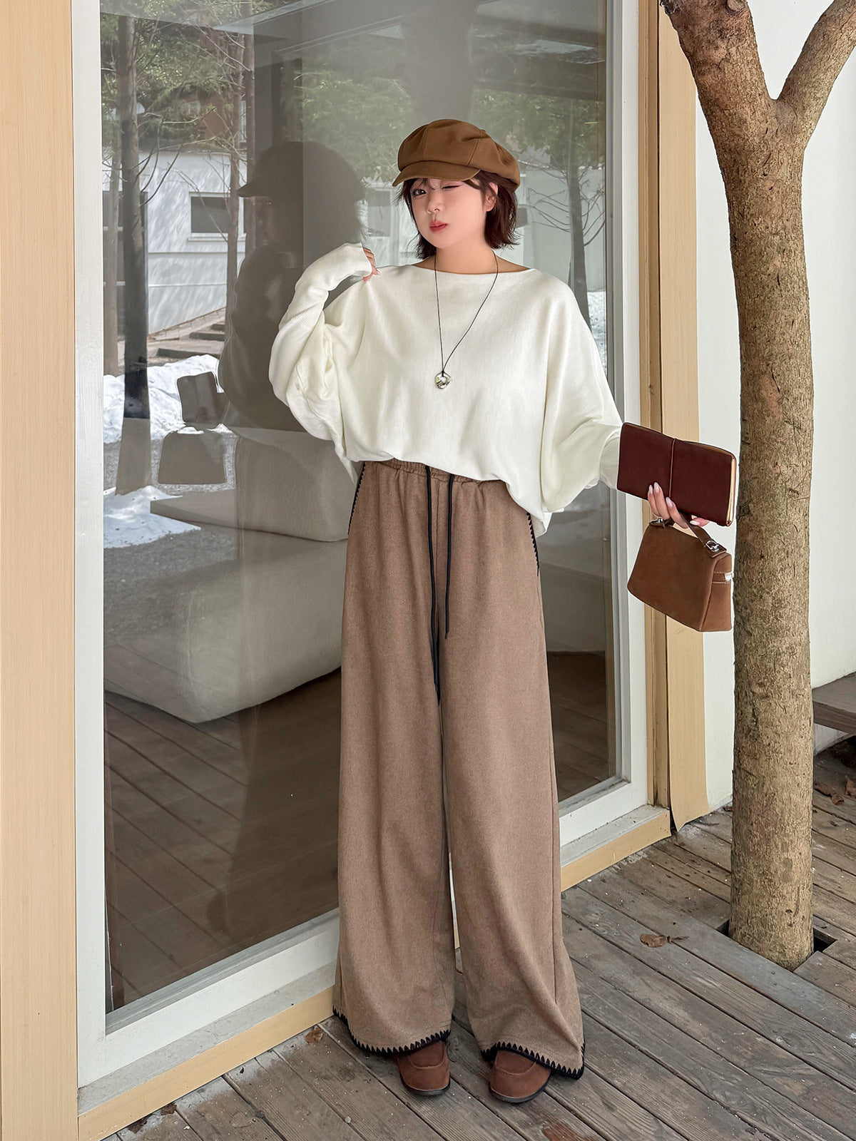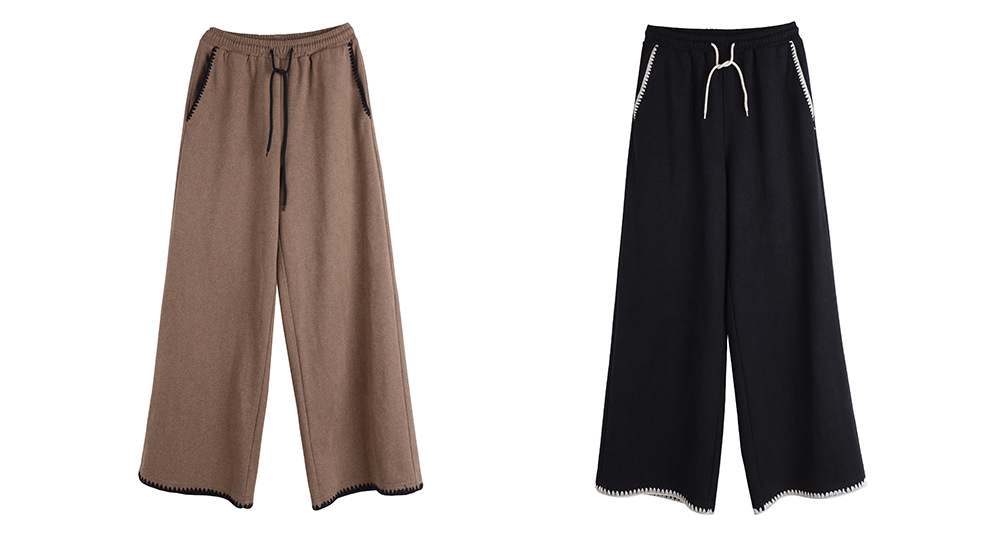 ウール風ワイドレッグパンツの生地は、少しざっくりとした質感でドレープ性も良好で快適な着心地です。ドローストリング付きの、ハイウエストでゆったりとしたフィットのウエストバンド。両サイドに斜めポケット付きで、ポケットの開口部とズボンの裾にはコントラストの効いたシェルエッジステッチが施されおり、特徴的なデザインです。ゆったりとしたフィット感で、スタイリッシュに着こなせるワイドレッグパンツを是非お試しください。