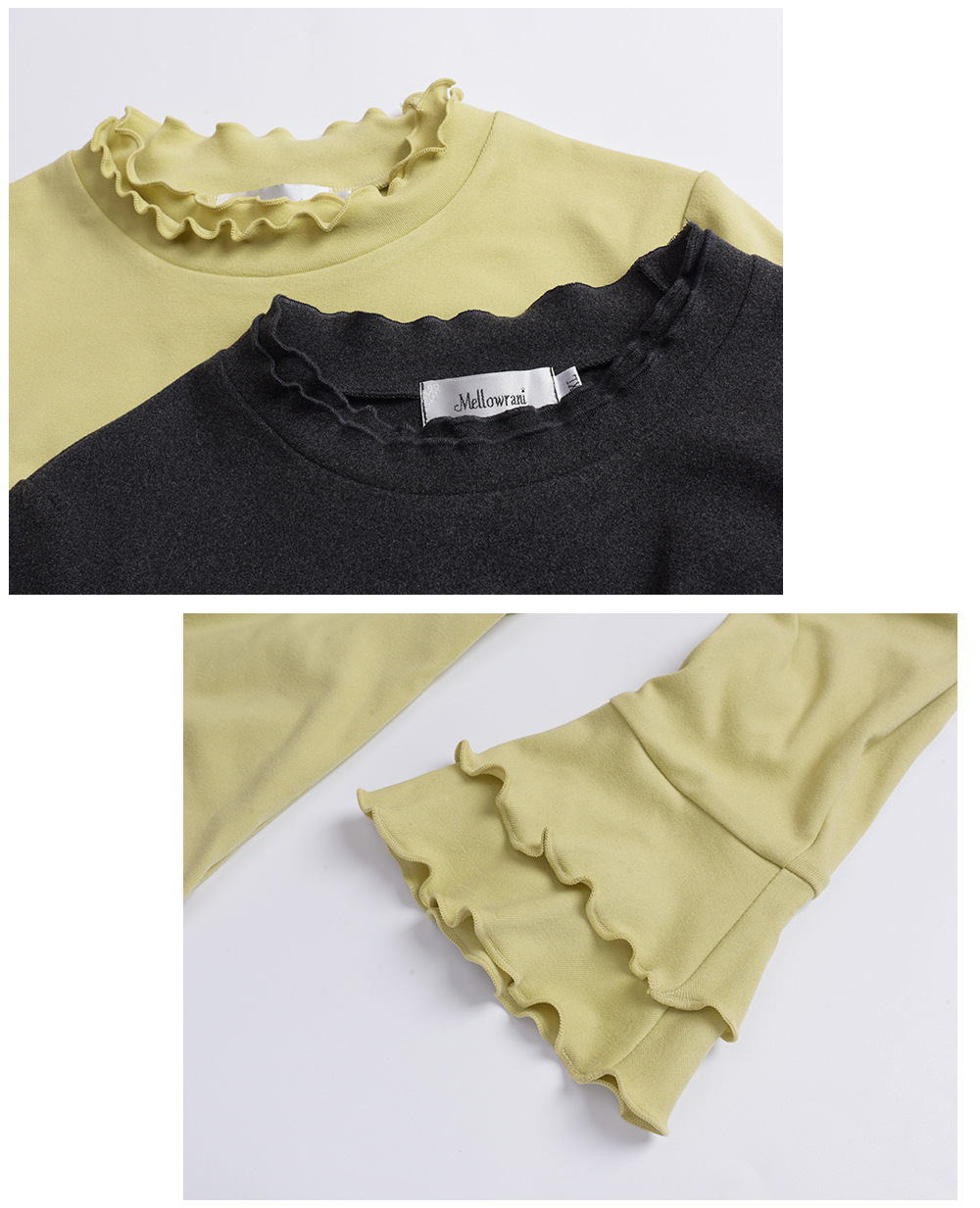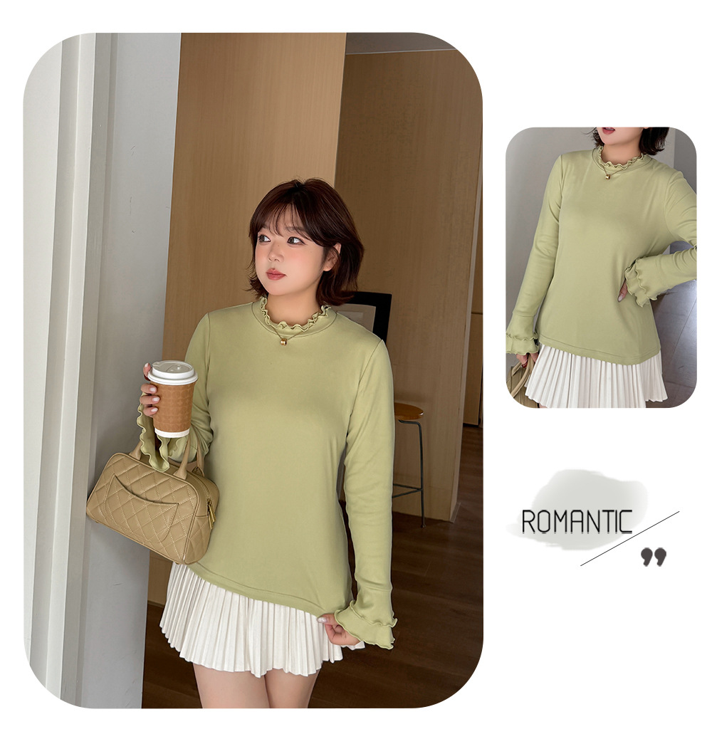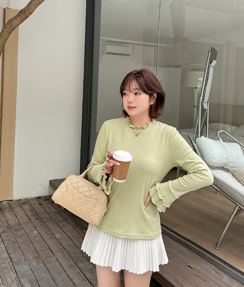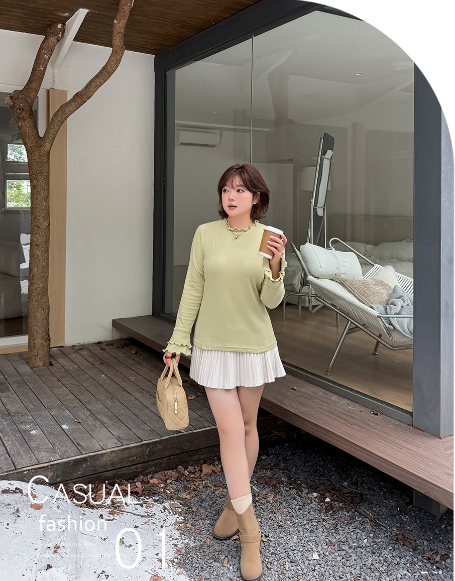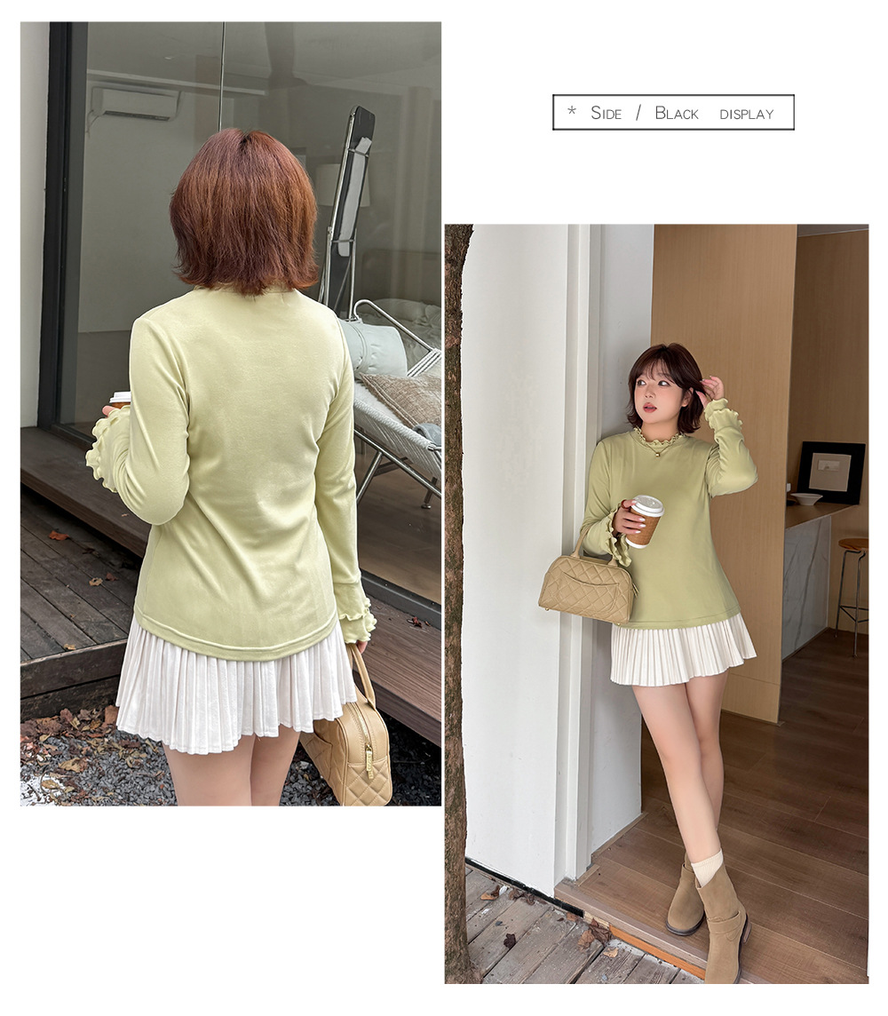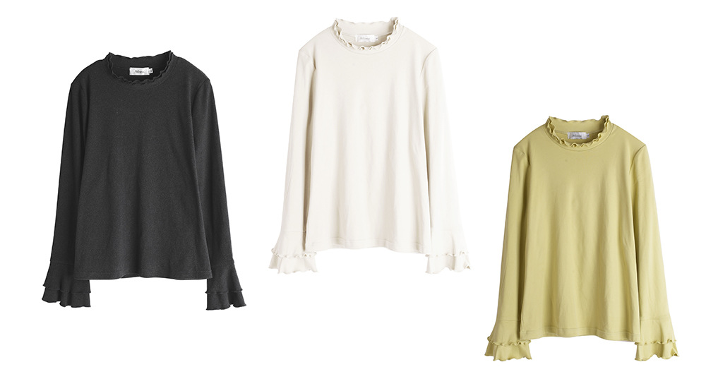 フリルネックスリムフィット長袖トップスは、とても柔らかくて着心地の良いフリース生地で作られています。暖かく着心地が良く、起毛した質感で伸縮性に優れています。フリルトリムの二重ラウンドネックラインのデザインで、袖口も二重のフリルになっており、シンプル×フェミニンの絶妙バランスが際立ちます。ウエストにフィットするデザインなので、インナーとしても一枚でも素敵に着こなせます。