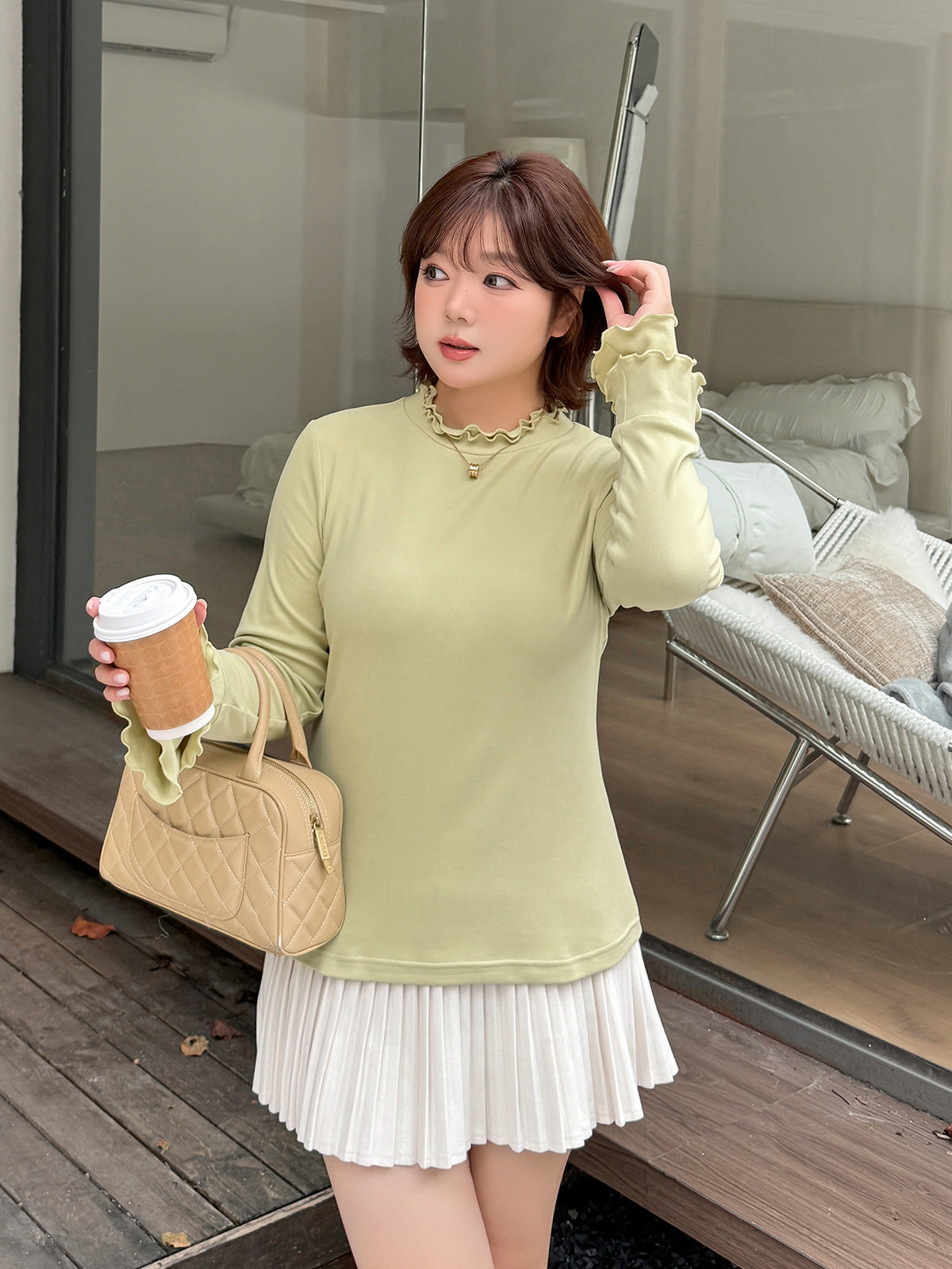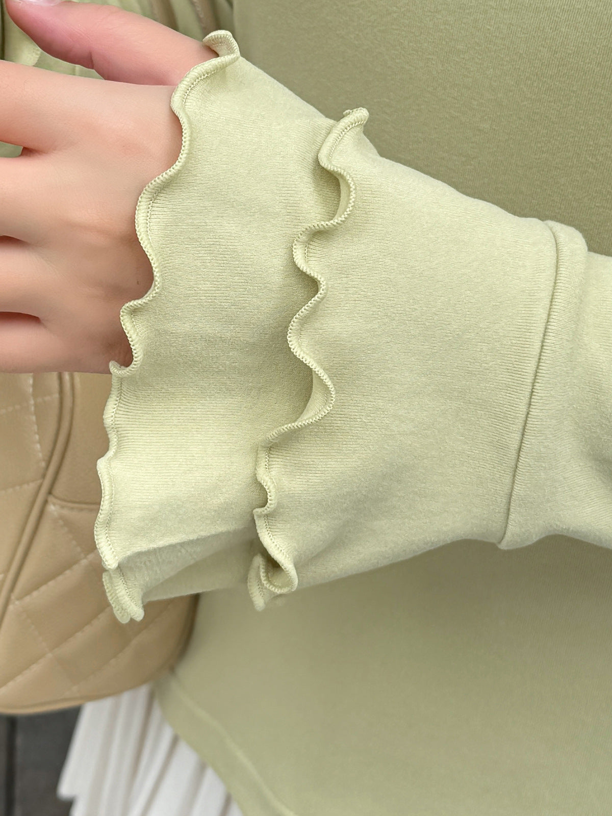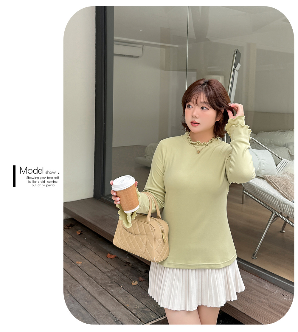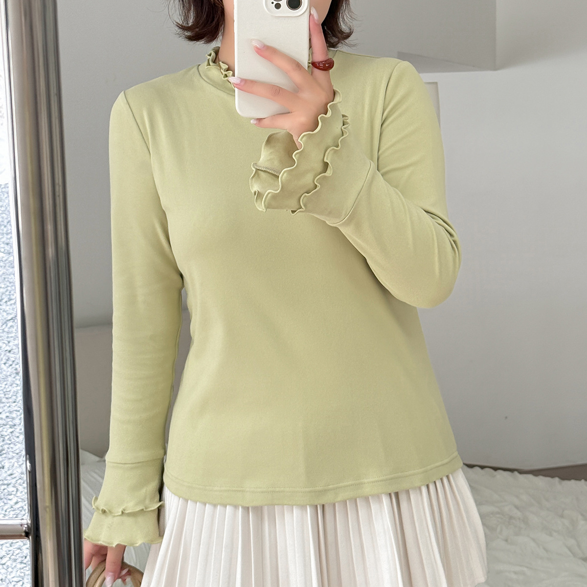 フリルネックスリムフィット長袖トップスは、とても柔らかくて着心地の良いフリース生地で作られています。暖かく着心地が良く、起毛した質感で伸縮性に優れています。フリルトリムの二重ラウンドネックラインのデザインで、袖口も二重のフリルになっており、シンプル×フェミニンの絶妙バランスが際立ちます。ウエストにフィットするデザインなので、インナーとしても一枚でも素敵に着こなせます。