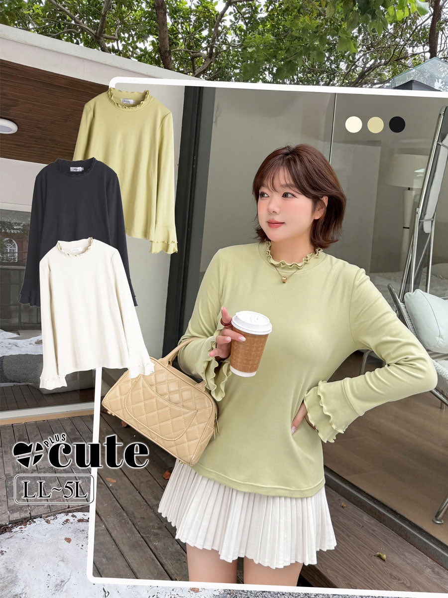 大きいサイズ レディース フリルネックスリムフィット長袖トップス LL 3L 4L 5L