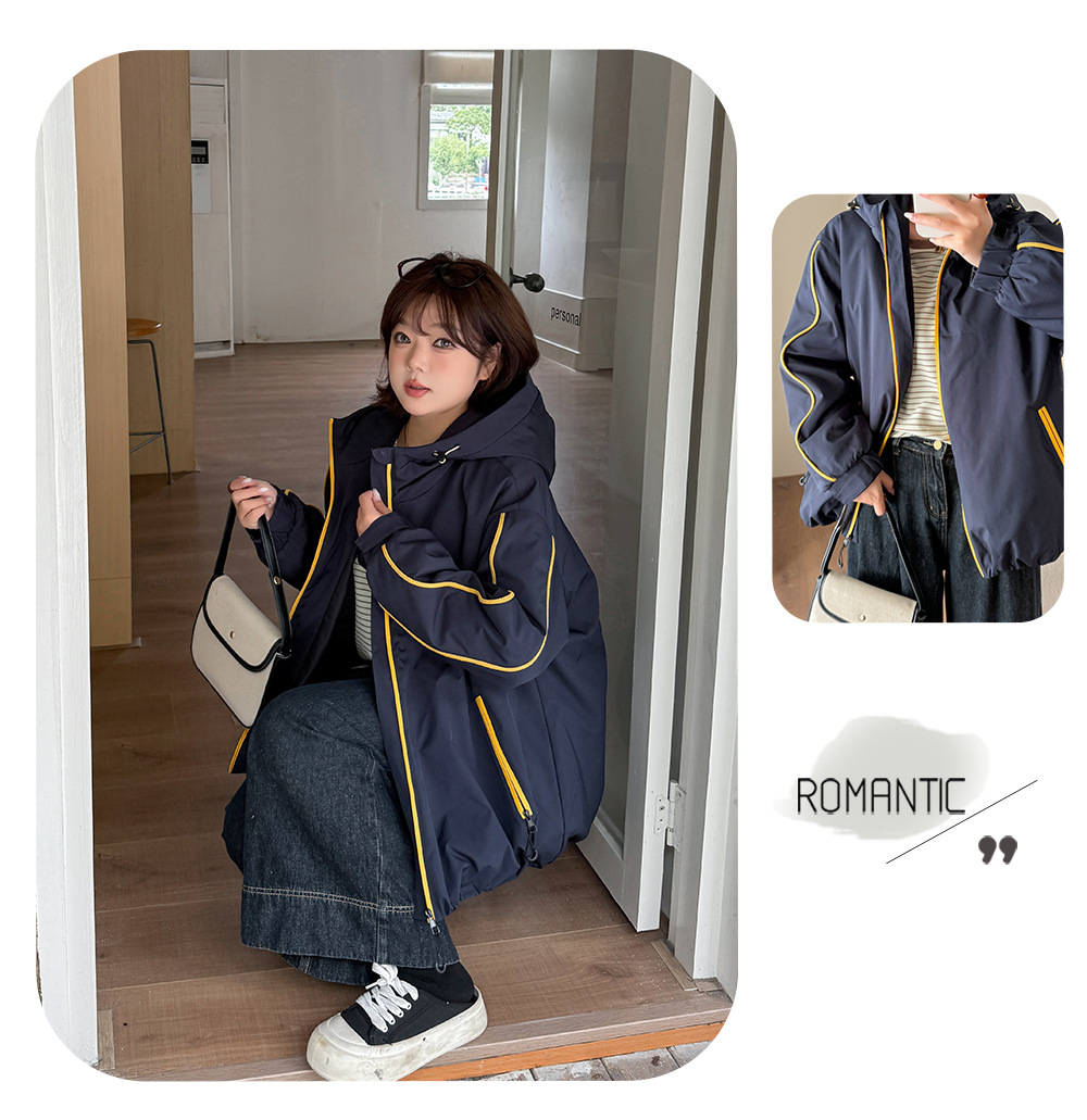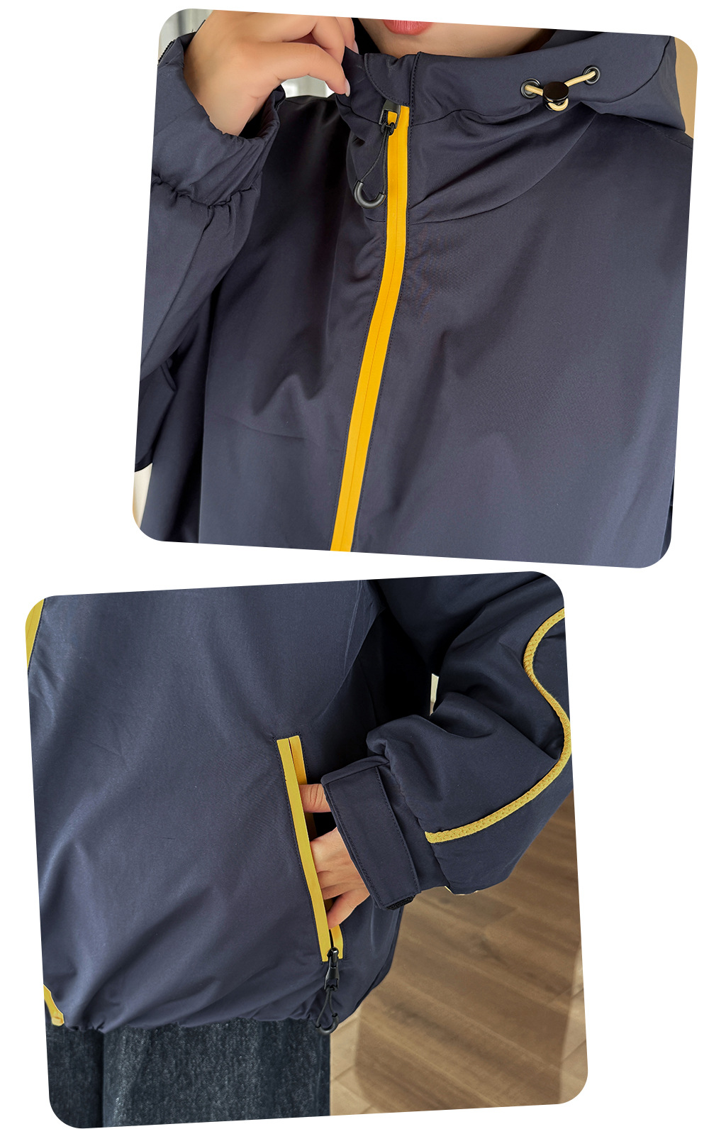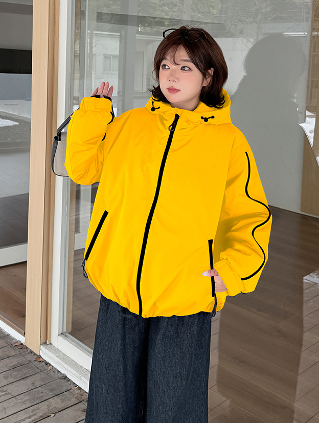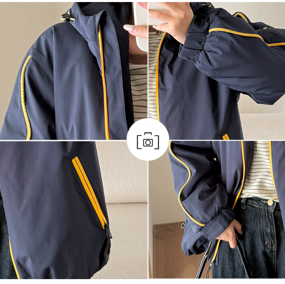 フード付きバイカラーパイピングカジュアルジャケットは、リラックスしたワークウェアのフィット感を特徴とし、バランスの取れたスタイルを提供します。柔らかいツイル織り生地にキルティングの裏地が付いているので、軽くて暖かい着心地です。つばにドローストリングが付いたフード付きデザインです。フロントパネルには防水性のあるカラーブロックジッパーが付いており、前面にポケットが2つ付いています。袖は、コントラストの効いたカーブしたパイピングが施され、リラックスしたドロップショルダーデザインです。袖口は伸縮性のあるデザインで、ベルクロ留めになっています。裾には調節用の伸縮性のある紐が付いています。デイリーに着用できるカジュアルジャケットを是非お試しください。