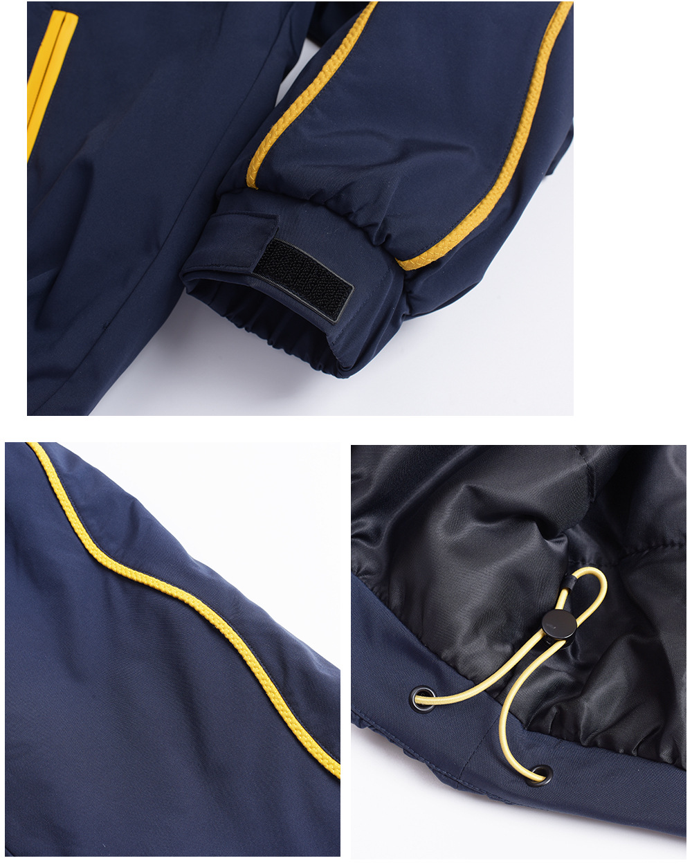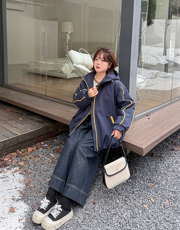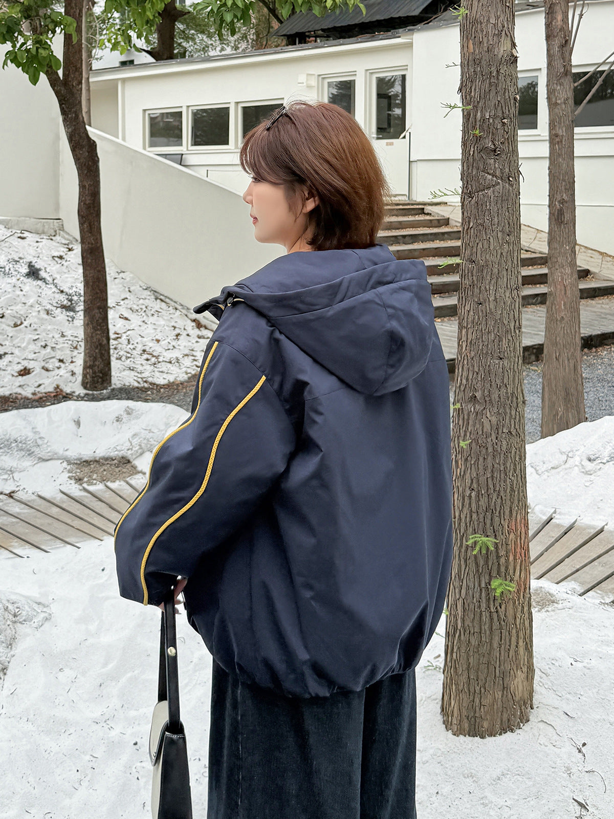 フード付きバイカラーパイピングカジュアルジャケットは、リラックスしたワークウェアのフィット感を特徴とし、バランスの取れたスタイルを提供します。柔らかいツイル織り生地にキルティングの裏地が付いているので、軽くて暖かい着心地です。つばにドローストリングが付いたフード付きデザインです。フロントパネルには防水性のあるカラーブロックジッパーが付いており、前面にポケットが2つ付いています。袖は、コントラストの効いたカーブしたパイピングが施され、リラックスしたドロップショルダーデザインです。袖口は伸縮性のあるデザインで、ベルクロ留めになっています。裾には調節用の伸縮性のある紐が付いています。デイリーに着用できるカジュアルジャケットを是非お試しください。